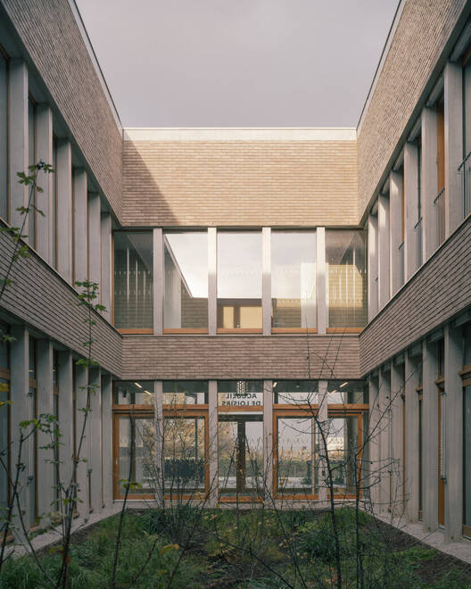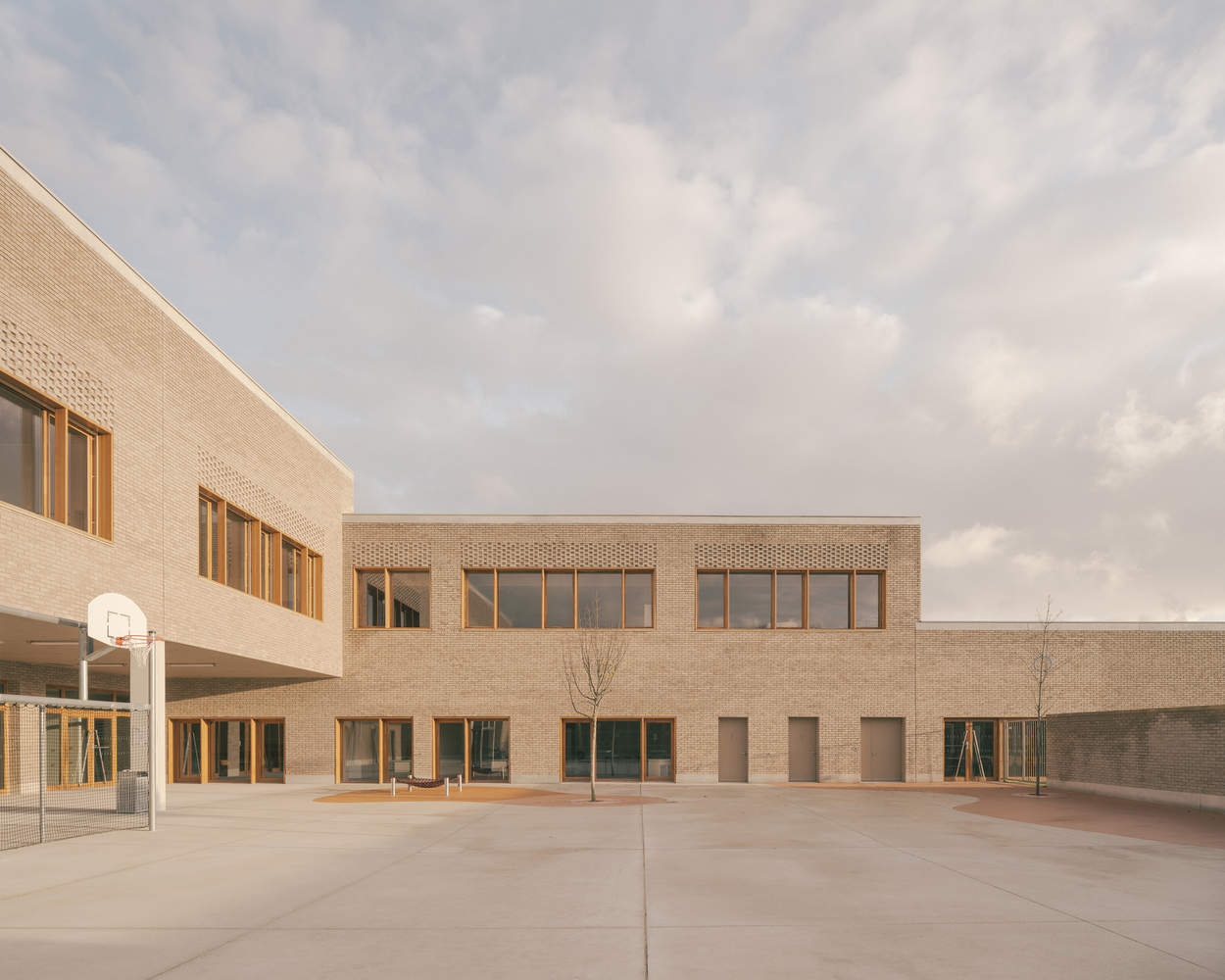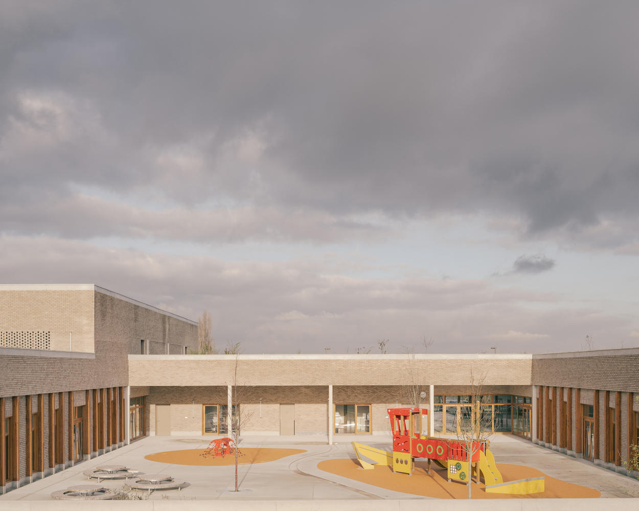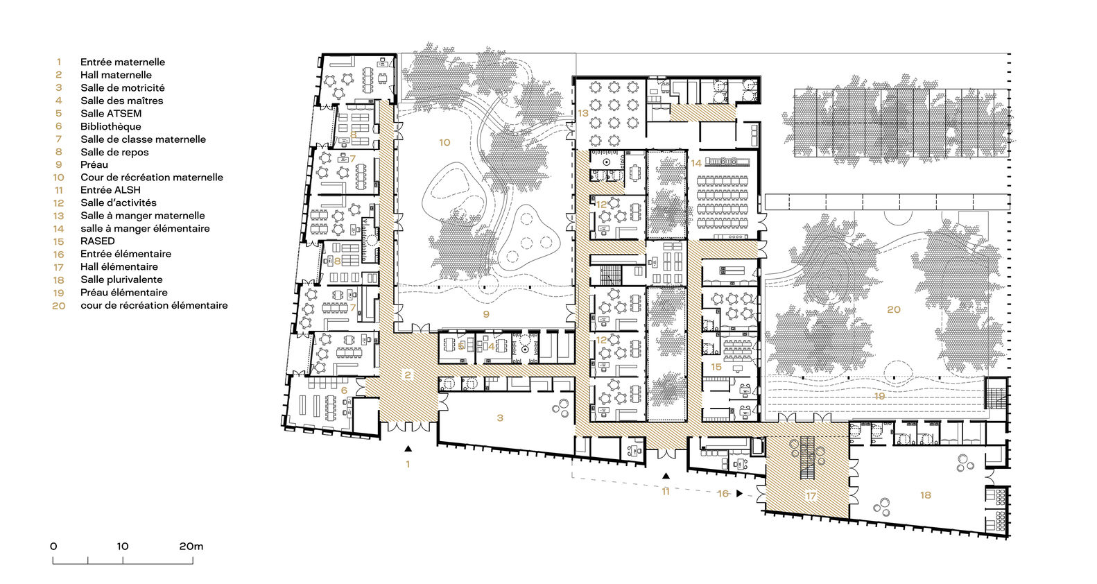The exterior envelope features a timber-framed façade, with a wooden spine grid on a concrete base, to reveal the building's structural logic. The use of natural materials, in particular the different uses of brick, is intended to achieve a different treatment of natural light depending on location and time of day, reflecting the thickness of the envelope. The entire school complex is organized in a comb shape around the two playgrounds, the canteen, the communal areas, and the ALSH, in the center of the plot, separating the kindergarten from the elementary school. The kindergarten is on the first floor only, while the elementary school is on two levels: the first floor for common areas and the ground floor + 1 for all classrooms and adult facilities. In this way, the three entities are rendered autonomous and easy to orientate, with each hall linked directly to an exterior: the two playgrounds and a 110 m² central patio. A second, smaller patio opens the elementary dining room onto an abundantly planted exterior.