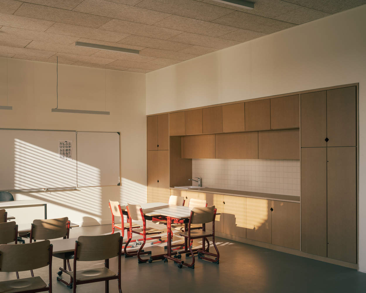 空间设计与功能结合:内部空间的组织充分考虑了学生的需求和学习环境。每个孩子都能拥有自己的学习场所和户外空间,幼儿园的回廊设计和小学的森林景观各有特色。卫生间的设计也别具匠心,小型观赏花园成为植物过滤器。走廊宽敞,形成城市与学校的界面,教室入口的门厅设计促进了孩子的归属感和方向感,同时保证了教室内外的互动和采光。