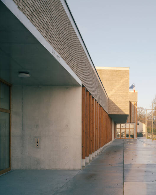 Text description provided by the architects. Like a piece of a puzzle, the school complex, comprising a nursery school, an elementary school, a catering center, and a day-care center, is built on a plot of land surrounded by the Joncs Marins, the Jardin de Traverse, a fabric of small houses and several multi-family housing projects. To fit in with this ensemble, we had to understand the urban project planned for this part of the eco-neighborhood to extract its essence: the school group is homogeneous, but each facade is treated independently, taking into account the direction in which the building faces. The result is a layered, volumetric landscape across the entire site, with three volumes emerging on the main façade on Avenue Jacqueline de Romilly, representing the three entities of the school group.