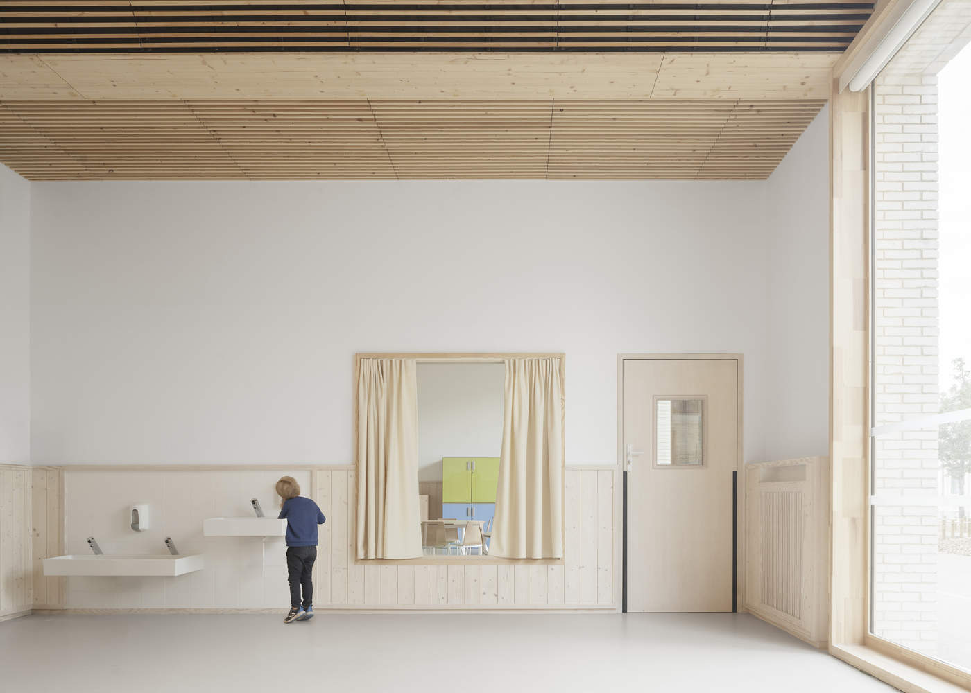 一楼主要用于托儿所,因此面向庭院,有利于直接和水平的外部关系。小学课后的主要生活空间位于楼上,朝南,围绕着一个室外露台。施工系统简单、可靠、经济。选择砖石地板和墙壁是为了应对与音乐实践相关的声学问题。