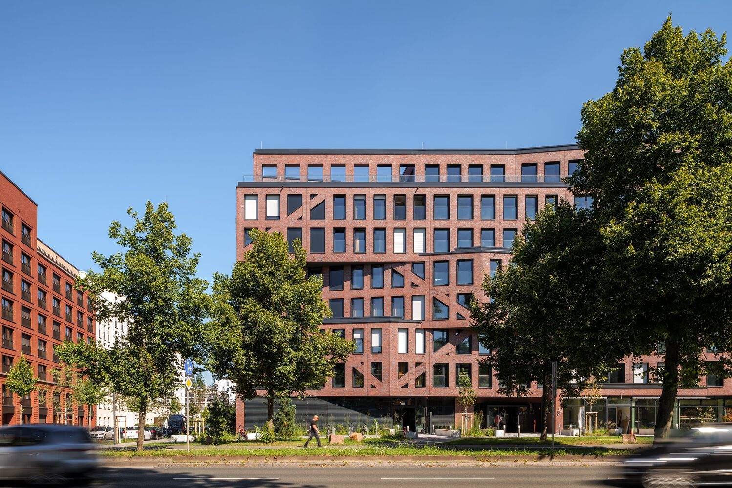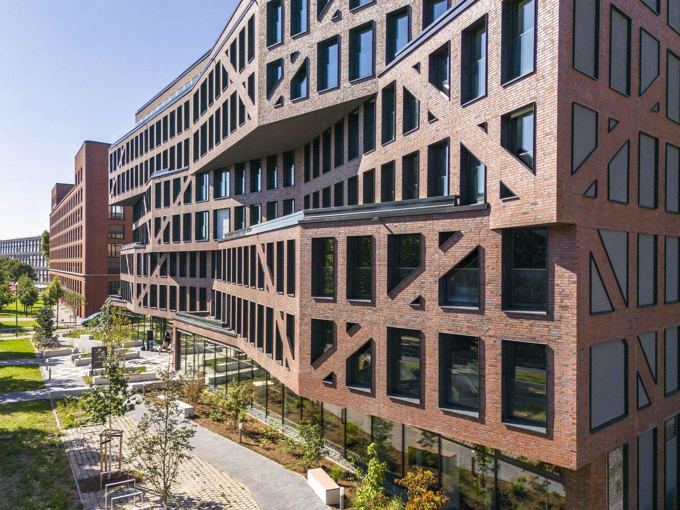 外观特色:该项目在外观上十分引人注目。大窗户和砖砌的交叉阴影图案,每两层楼有开放式露台,创造了动态的立面。起伏的立面允许自然种植,增加了绿色元素。同时,为避免显得过于气势逼人,设计融入了“地方差异的时刻”,如西面正面从砖砌变为浅色灰泥。金属扶手也为建筑增添了亮度和活力。整体设计将两种住房方案设想为一个单一实体,展现了理性与情感的结合。