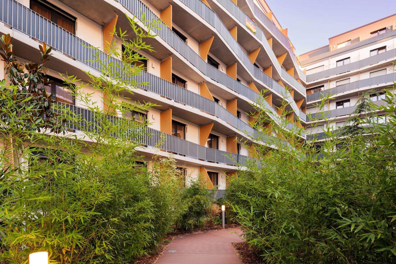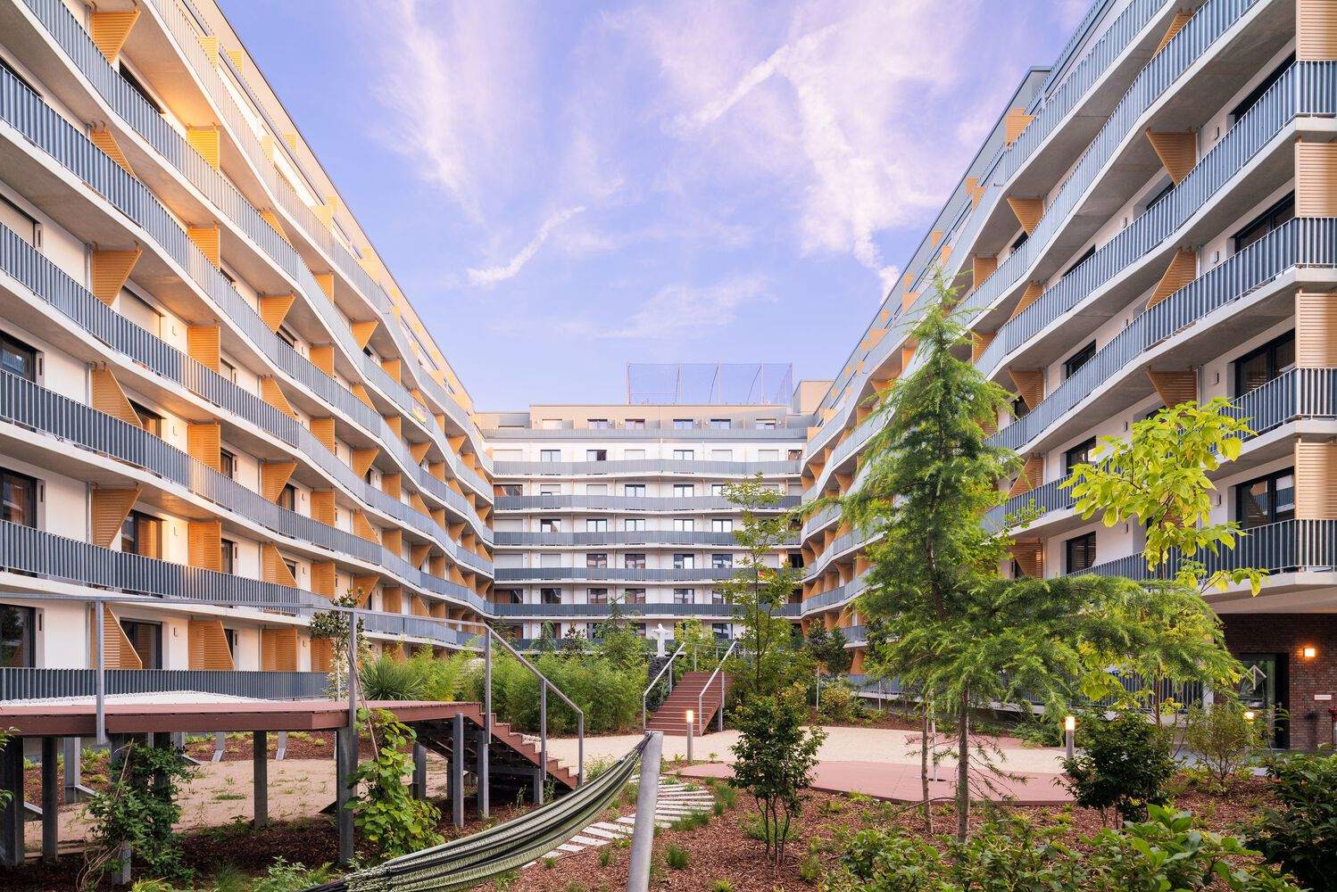 iLive Frankfurt stands out on Adickesallee Strasse with its striking façade. This is the front of the Hotel Rioca, featuring large windows and a brick cross-hatching pattern, with open terraces every two stories running along the face of the building, extending inwards and outwards. This design creates a façade that appears in motion, with individual folds rippling across its face. HWKN partner Robert May describes this design as "a marriage of the rational and emotional." The undulating façade also allows for natural planting on its terraces, adding a green element that is both surprising and sought-after. To prevent the iLive campus from appearing unnecessarily imposing, HWKN's design incorporates 'moments of local difference.' For example, the western frontage changes from brick to lighter stucco. Atop the middle section of these buildings is a set-back covered terrace, with a columned façade similar to that on the lower floors. Metal accent handrails add luminosity and spark. HWKN envisioned the two housing alternatives on the iLive campus as a singular entity.