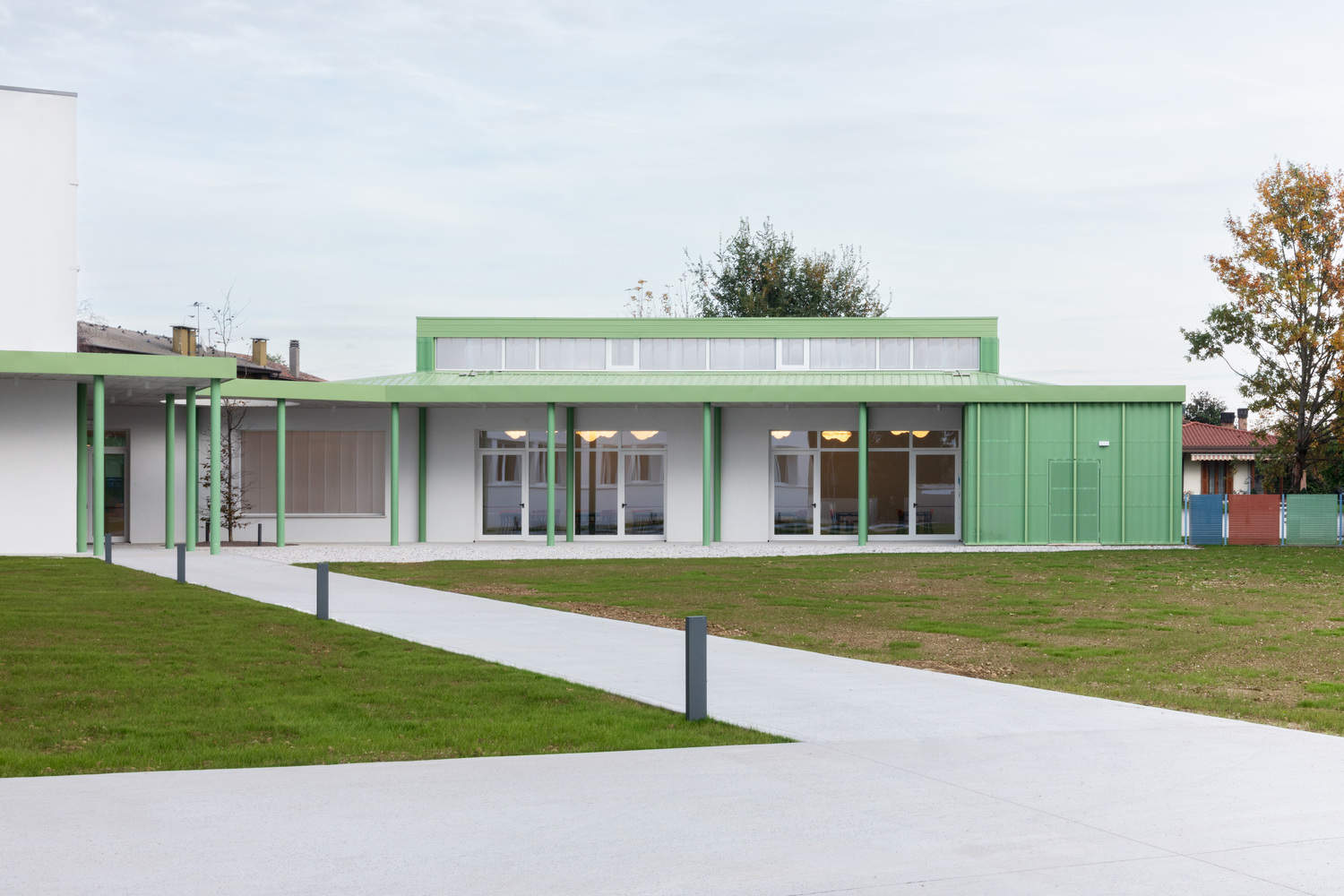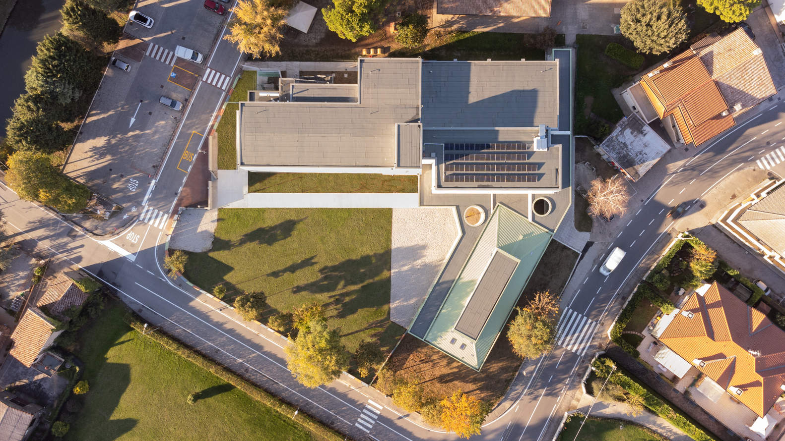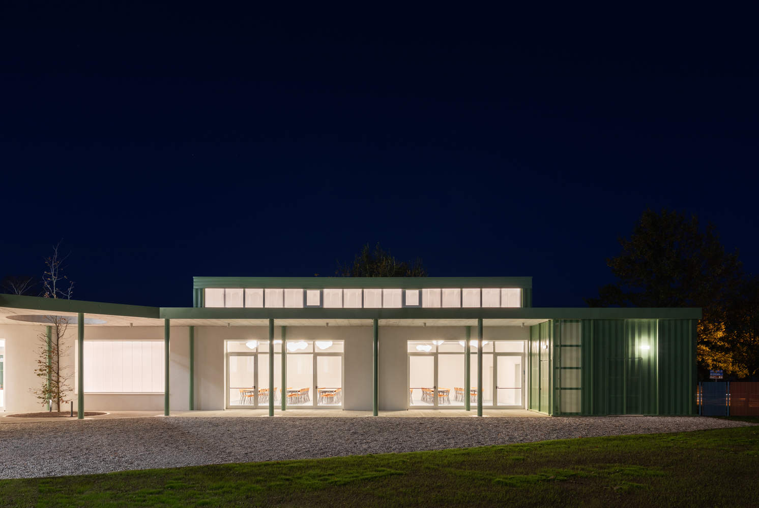 The light green metal cladding of the new volume housing the canteen is a choice that combines aesthetics and functionality. On the one hand, the color blends into the landscape, creating a sense of continuity with the surrounding nature. On the other hand, the metal surface gives the building a contemporary and dynamic appearance.