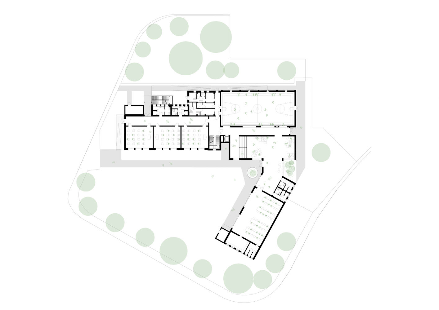 食堂所在的展馆,其形状和顶棚与校园环境完美融合,创造了一个新的空间,增强了现有的绿地。花园是教育项目不可或缺的一部分,经过重新设计,在室内和室外空间之间创造了一个连续体。大窗户让学生可以在一天中的任何时间享受大自然,促进他们的健康。