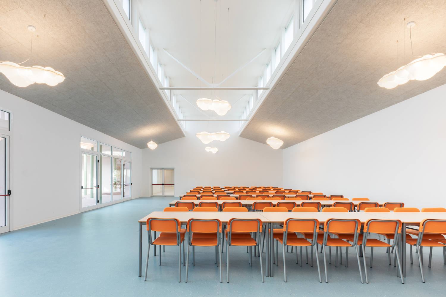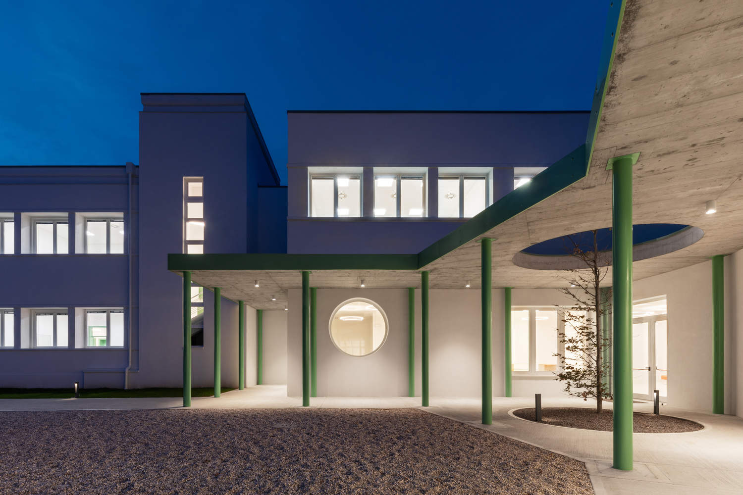 The pavilion housing the canteen, with its shape and canopy, integrates perfectly into the context of the schoolyard, creating a new space and enhancing the existing green area. The garden, an integral part of the educational project, has been redesigned to create a continuum between indoor and outdoor spaces. The large windows allow students to enjoy nature at any time of day, promoting their well-being.