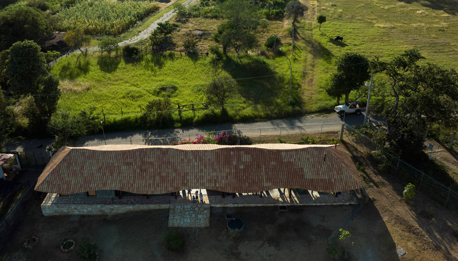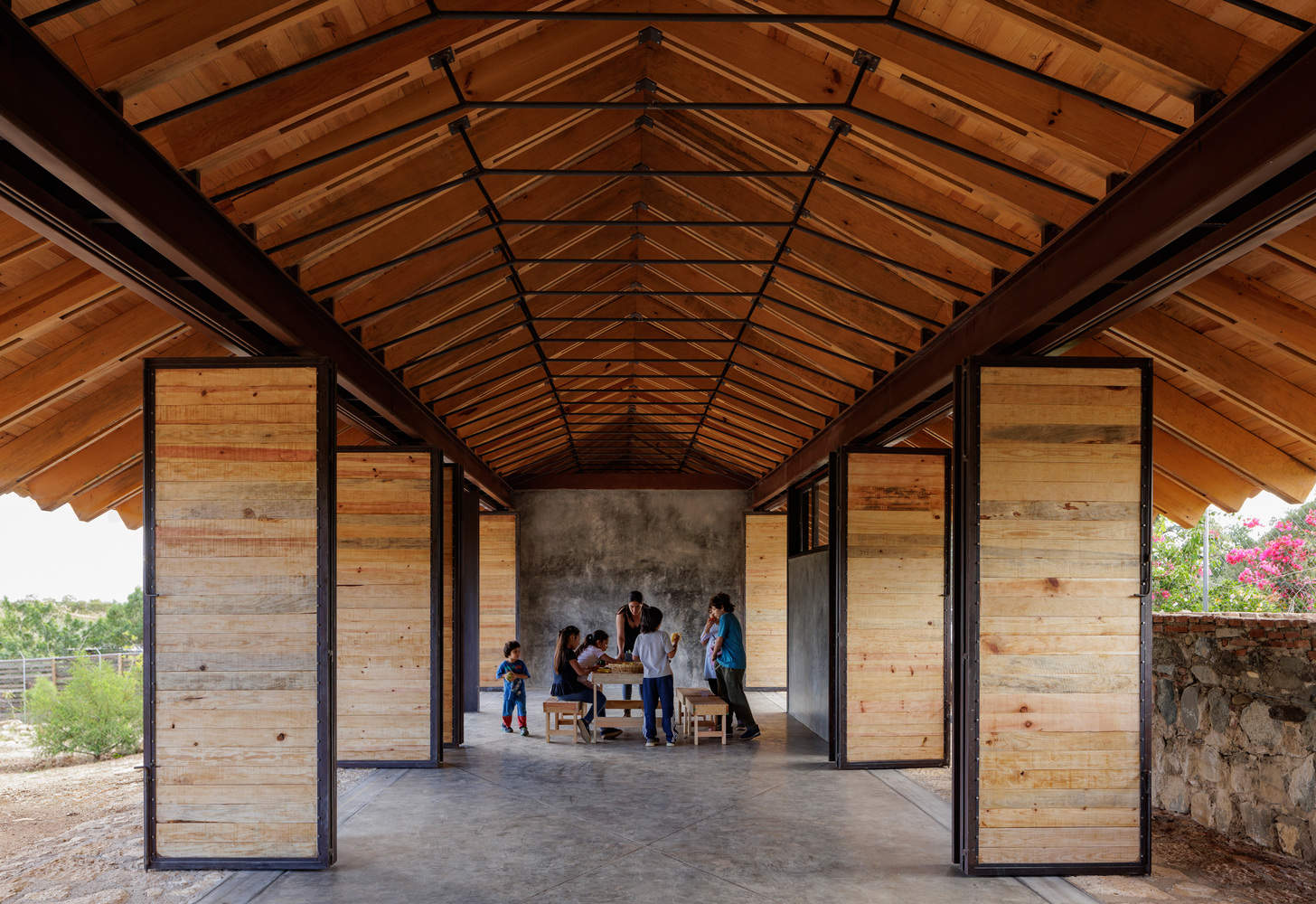 In a playful way, the piece opens completely, allowing the wind to pass through, filtered light to enter and a closer relationship with the landscape. The height of the roof allows for sufficient air volume to regulate the temperature of the building and to diminish the amount of material used for the roof and walls to a minimum, significantly reducing the impact of the construction on the site. The building materials are either recycled or acquired within the same community, which promotes a link between the students, the surroundings and the landscape, while also responding appropriately to the structural and climatic conditions of the building.