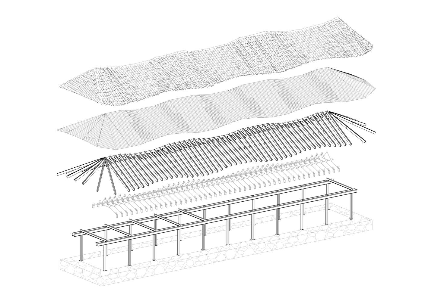 The construction process considers the construction worker's conditions: the roof is built first and the floors and walls afterward, which means that they work in the shade for the majority of the construction time. Following this process, the wooden roof trusses were prefabricated in the shade and then placed on the metal beams.