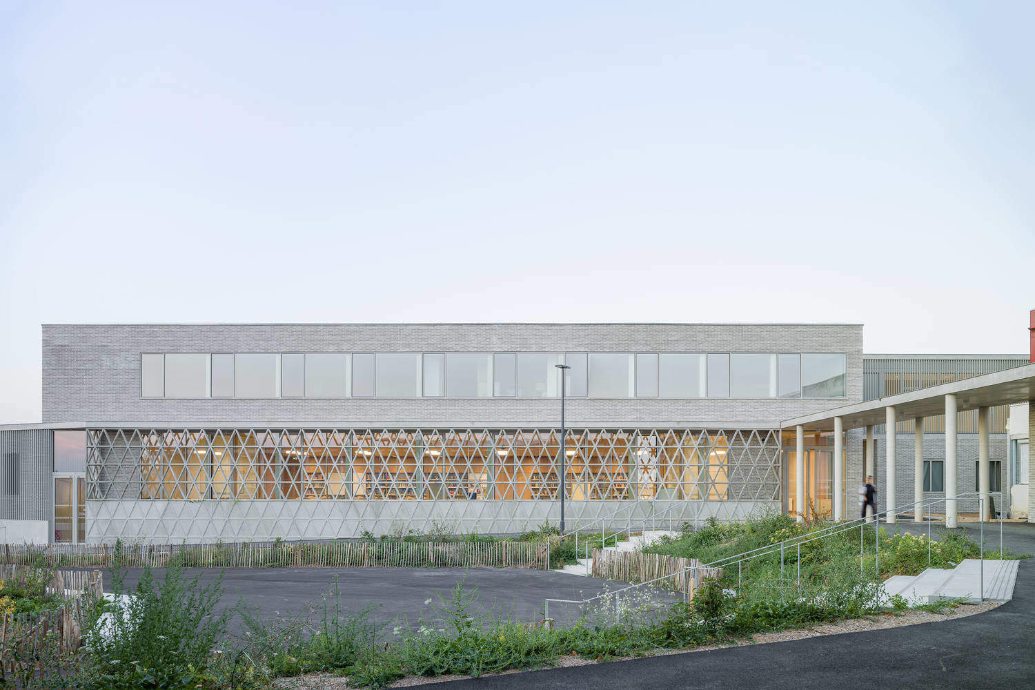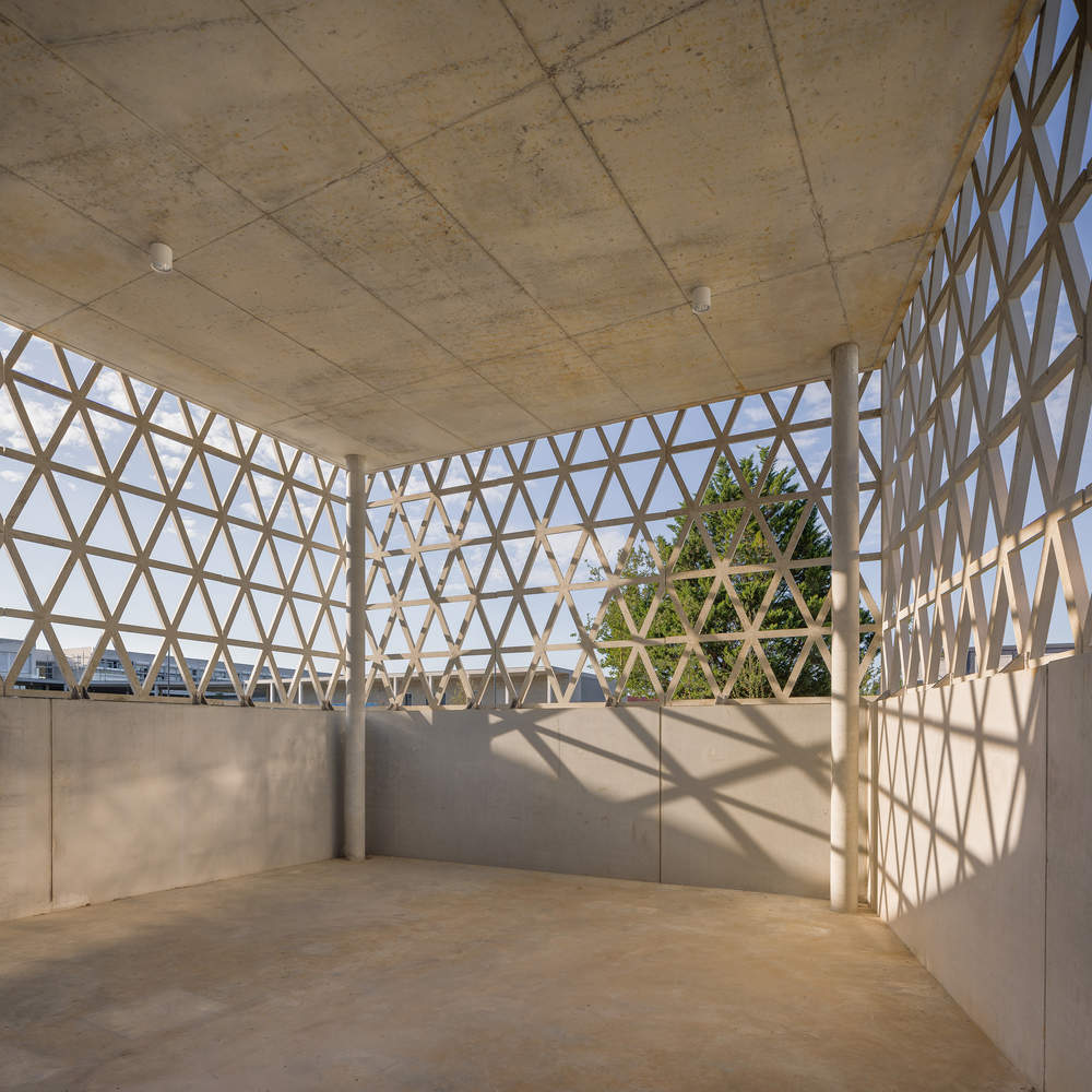 The concrete grid also creates a filter from the library, providing privacy for students during work sessions without losing contact with the outside world. The complex geometry of this second skin prompted everyone involved to get involved in the design and construction on site.