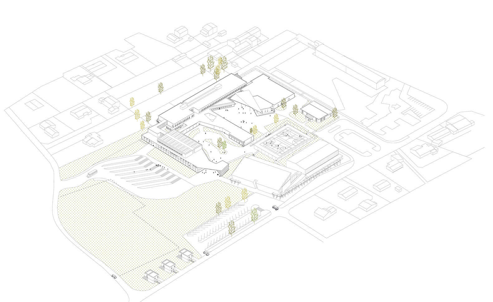 向南延伸,立面以门廊为标志,加强了学校的存在感。扩建部分的主体和自行车房之间留有一个空隙,由一个宽大的顶棚连接。此表格定义了建筑物的入口。