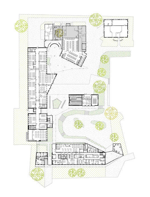 因此,学校不仅在今天,而且在未来都在社区中确立了自己的地位,因为这些观点也随着未来体育设施的存在而得到了思考,并为此预留了土地储备。门廊的设计和扩建部分的体积表达了该机构的制度价值,而砖块的温暖物质性、耐候钢的暖色、自行车架的主题以及将自然重新引入庭院,从机构的门槛开始就宣布了一个地方的氛围、空间和使用质量,在这个地方,人们应该感觉良好,可以传播和接受知识,在机构的生活中工作。
