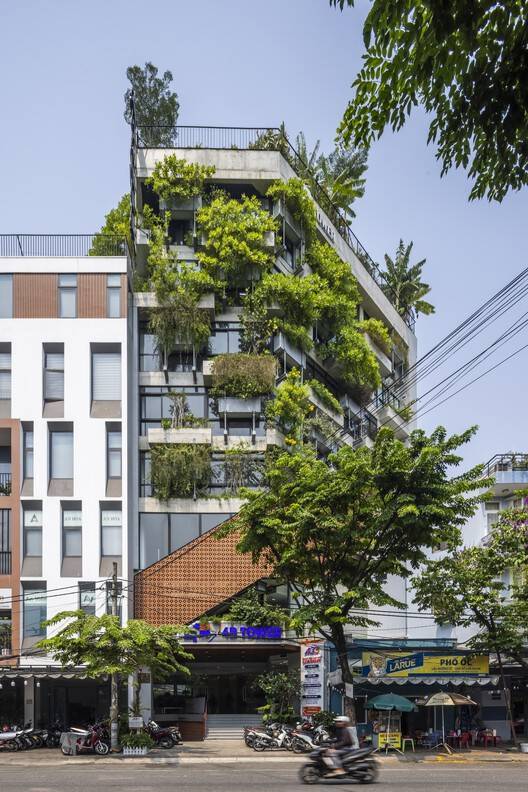 建筑师提供的文字描述AEC 4B Tower位于年轻城市岘港充满活力的中心地带,有9层楼和1个地下室。该项目展示了一种创新的建筑设计,与自然绿化相协调,同时通过可持续战略最大限度地利用自然能源。