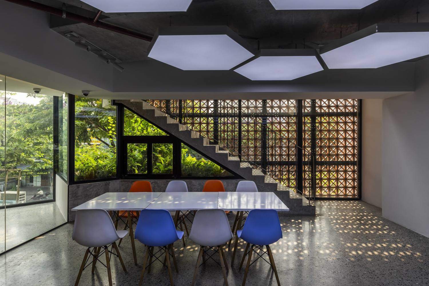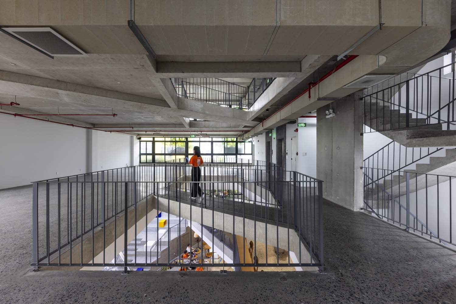 创新设计与自然融合:4B Tower 位于岘港活力中心,其设计创新地与自然绿化相协调,通过可持续策略充分利用自然能源。外部未加工混凝土与弯曲赤土砖百叶窗系统及悬挂花盆等元素,凸显了建筑的年轻与绿色活力。内部质朴的混凝土材料营造出吸引人且充满活力的空间,为年轻学习者提供了理想场所。