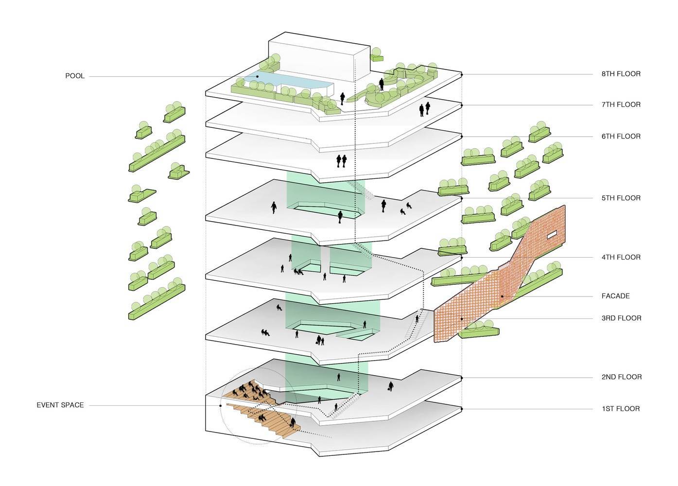 这种互动是开放、主动学习的重要基础。教室用透明玻璃隔开,以减少噪音,同时保持开放的氛围。清新的绿色植物进一步增强了空间,植物床从建筑外部延伸出来。屋顶游泳池提供城市全景,提升了用户体验。除了一条被郁郁葱葱的绿色植物环绕的步行道,让人联想到乡村,屋顶成为了放松和团队合作活动的中心。