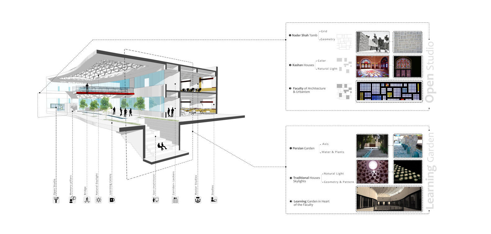 —在空间中应用伊朗建筑的特征:重叠的框架、透明度、反射、波斯花园中的存在感,以及使用水、光、彩色玻璃、门廊、桥梁、楼梯和柱子(记忆)等元素