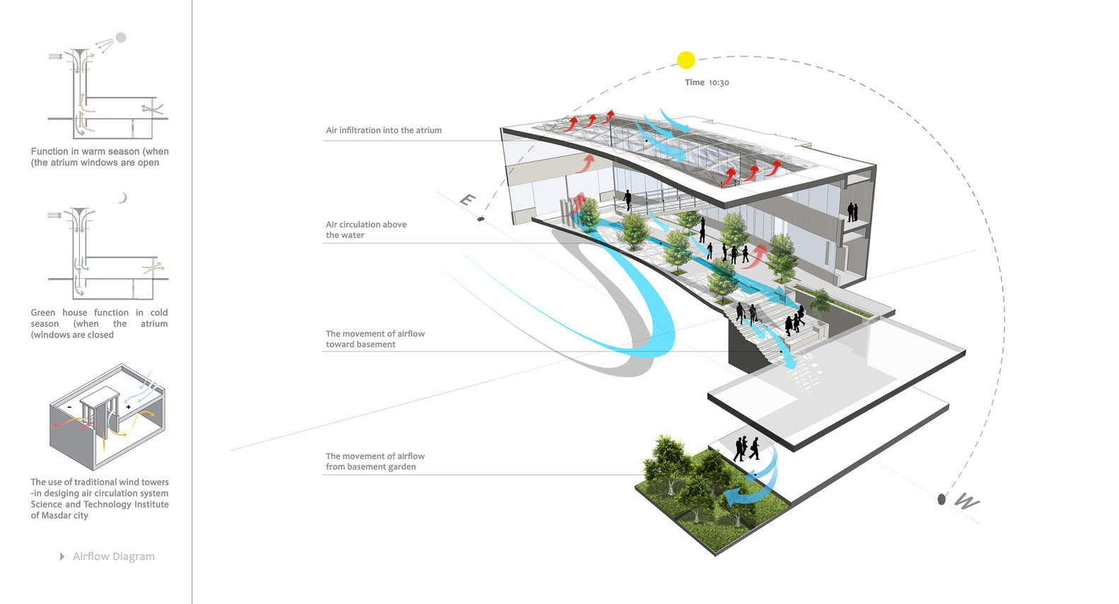 -营造小气候:中庭空间在冬季充当冬季花园。夏天打开阀门,在楼下营造出类似地窖的环境,产生捕风效果。