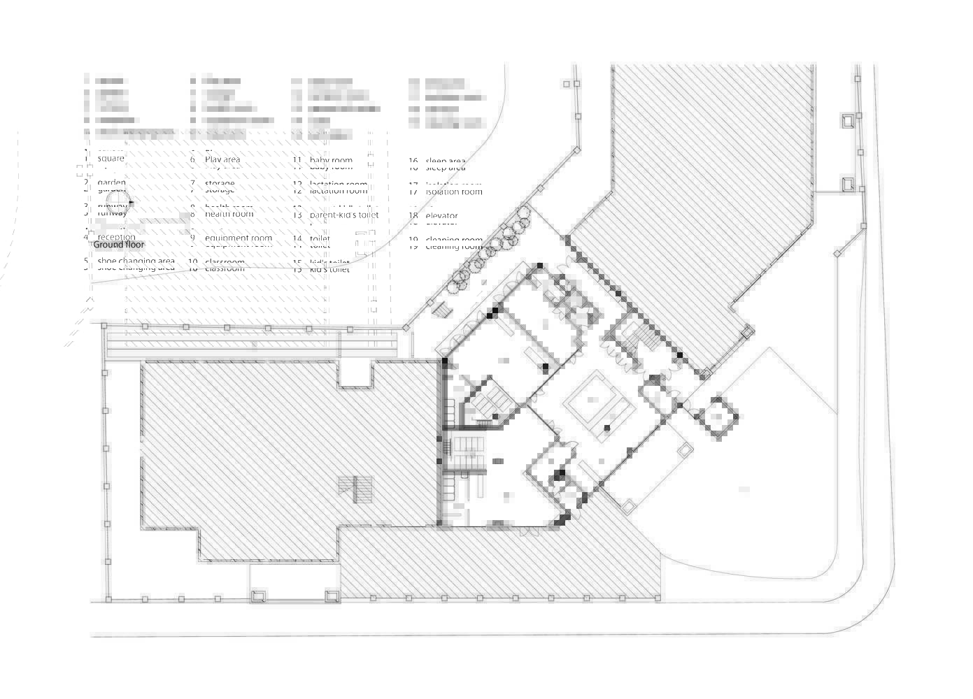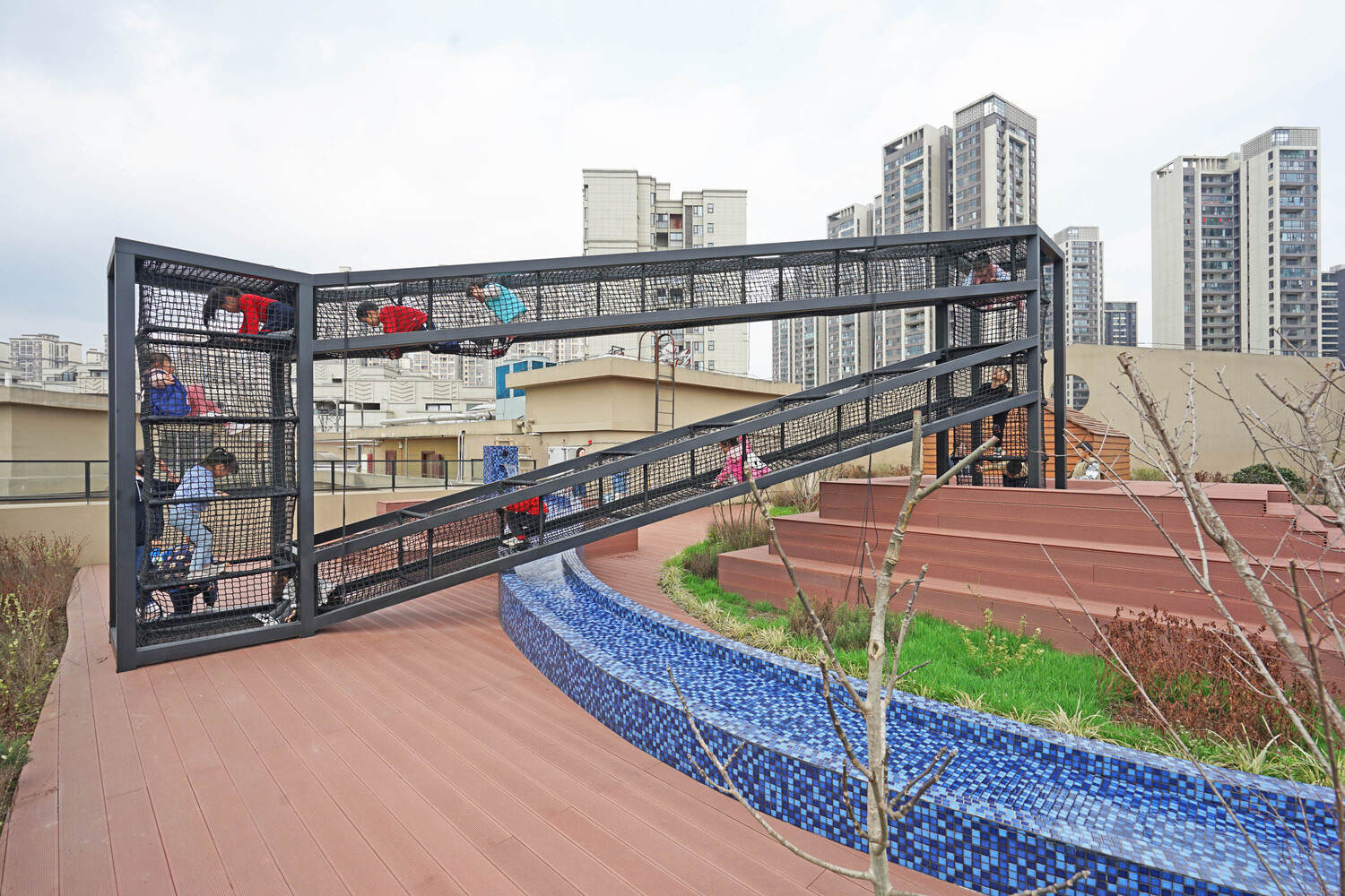 贵州的景观是独特的,这要归功于喀斯特地貌的历史形成。它由山脉、河流、瀑布、石灰岩洞穴和湖泊等自然元素组成,这些元素都是由喀斯特地貌形成的。这个网站提供了一个有趣的轮廓,充满了起伏。孩子们经常聚集的餐厅、候诊室和托儿所的内部模仿了Kiyo的美丽地形。露台上有两层完全由网构成的游乐区。台阶不仅可以反映内部的户外景观,还可以让孩子们在观察溪流周围环境和拥抱他们的城市的同时享受上下攀爬的乐趣。通过这样做,孩子们在日常活动中感受到了自己城市贵阳的地形。通过这些日常活动,孩子们的身体健康和力量逐渐得到改善。此外,在孩子们可以触摸到贵阳喀斯特地貌石笋的地方安装了百叶窗,以便孩子们进一步欣赏当地的地形。