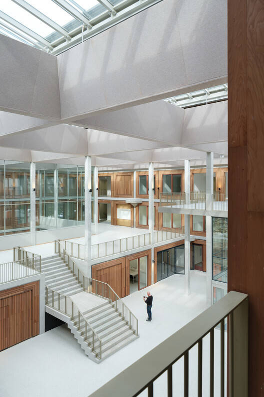 Reuse - The reuse of most of the original building and façade is a notable achievement. Concrete columns from the demolished central house were reused in the extension. Other materials were also given a new life. For example, the old Sequoia redwood ceiling panels were transformed into wall cladding in the atrium. These slats were carefully worked on, stripped of nails, and milled in collaboration with the social workshop BWRI. The specific pattern of the slats meant that everything could be prefabricated and installed, minimizing waste.