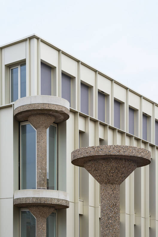 由于受保护的城市景观,这意味着Van Stigt的原始结构是一座受保护的建筑,立面的变化被控制在最低限度。特别引人注目的是带有锥形顶部的预制混凝土柱,有些带有圆形阳台,在翻修后的建筑中完全可见。这座温馨的建筑向城市开放:入口将外面的广场与里面的广场连接起来,与环境互动。有更多的空间供人们见面,无论是在咖啡角的内部还是在广场的座位周围。该建筑是人类校园的一部分,未来几年将进行改进,以更好地与城市和绿运河公园相连。这座建筑是这一过程的第一步。