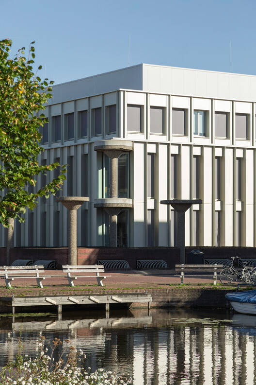 Due to the protected cityscape, which means that Van Stigt's original structure is a listed building, the changes to the façade have been kept to a minimum. Particularly striking are the prefabricated concrete columns with conical tops, some with round balconies, which are left fully visible in the renovated building. The welcoming building opens up to the city: the entrance connects the square outside with the square inside, creating interaction with the environment. There is more space for people to meet, both inside at the coffee corner and outside around the seating elements in the square. The building is part of the Humanity Campus, which will be improved in the coming years to better connect with the city and the Green Canal Park. This building is the first step in this process.