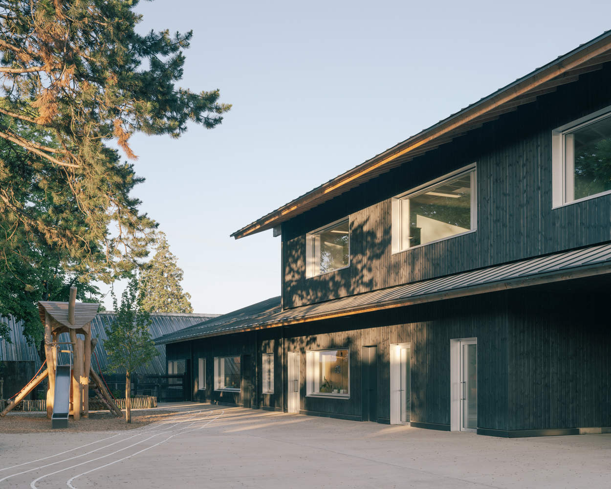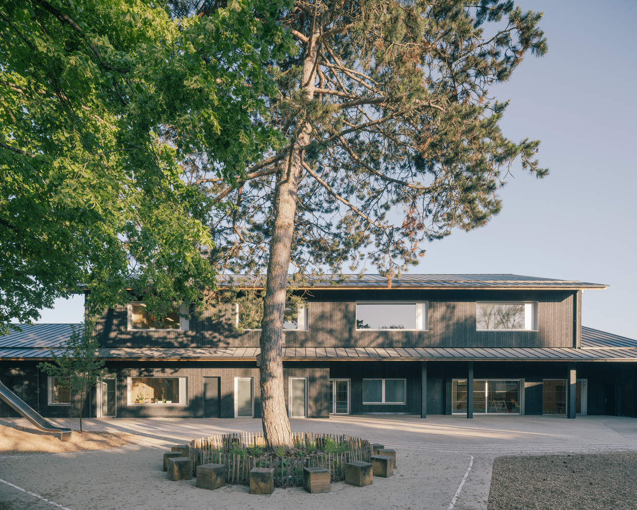 These joint intentions for a virtuous construction site and an allusion to the cabin symbol demonstrate an architectural approach that is both technical and sensitive. Thus, for the first time in Tours, the structural work with a wooden frame is combined with straw insulation. This modest yet subversive insulation method sets the facility apart from standardized construction by emphasizing the uniqueness of its conceptual approach. The selected Northern Pine for the vertical cladding elements echoes certain constructions in this diverse neighborhood. Thermally treated and stained to enhance its durability and anticipate its aging, the wood has a dark hue chosen for its convective properties, which will help warm the interior spaces during the cold season. The slender lines of the roof overhangs above the forecourt and courtyard form the first shelter against natural elements, whether rain or sunlight. In summer, the roof overhangs combine with the vegetation to protect the facades and their large windows from prolonged sun exposure. The dimensions of these windows, made possible by their discreet and efficient aluminum frames, benefit the classrooms, which enjoy high-quality light and exceptional views of the natural landscapes designed by the landscapers.