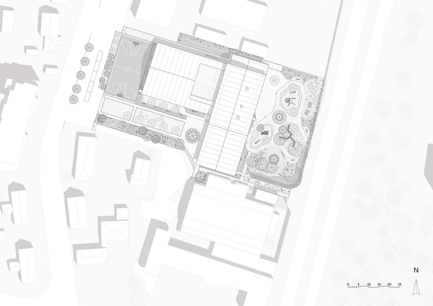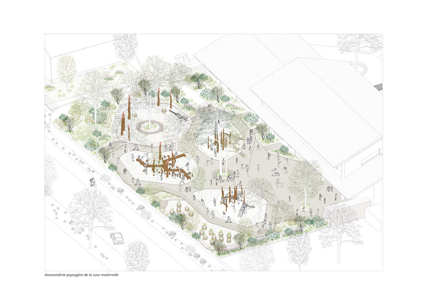 The implementation of the project combines the requirements of the program with a genuine desire to deepen the links established between the school and its landscape context. This conceptual intention is seen in a triptych as one progresses through the building, with the first part embodied by the forecourt. At the school's entrance, the forecourt serves the dual role of a welcoming space for the students and a public space open to parents and all residents. Its rational design and generous dimensions facilitate multiple uses and provide a reassuring setback from Rue du Colombier. Next comes the teaching building, whose educational program, as shown on the floor plan, is complemented by an early learning dimension. The interplay of openings and elevations offers views of the surrounding environment and landscape, whether near or far. Moreover, the school acts as a bridge between two outdoor spaces, allowing for a gradual transition to intimacy—from the public forecourt to the protective enclosure of the playground. This playground set back from the street and its nuisances, forms the last panel of the triptych. Designed as a play and relaxation area, it is also a fertile ground, both stimulating and educational. In contrast to the forecourt, its layout combines organic forms with a strong vegetal presence, highlighting the existing trees.