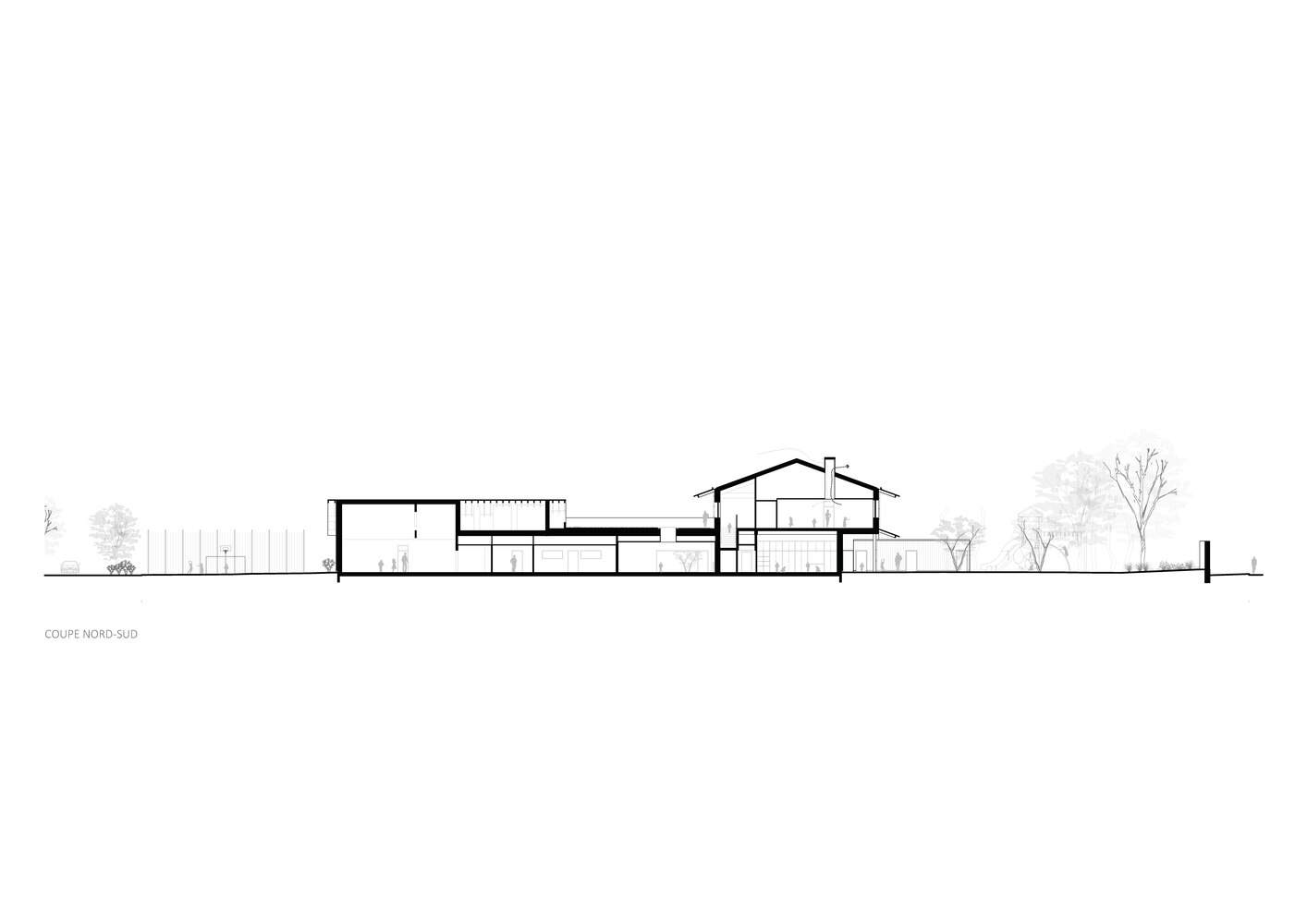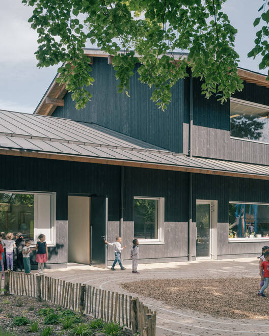 这些对一个良性建筑工地的共同意图和对小屋符号的暗示,展示了一种技术性和敏感性的建筑方法。因此,在图尔,木框架的结构工程首次与稻草隔热相结合。这种适度但具有颠覆性的隔热方法通过强调其概念方法的独特性,使该设施与标准化建筑区别开来。选定的Northern Pine作为垂直覆层元素,与这个多样化社区的某些建筑相呼应。经过热处理和染色以提高其耐用性并预测其老化,木材因其对流特性而选择了深色色调,这将有助于在寒冷季节为内部空间供暖。屋顶的细长线条悬在前院和庭院上方,形成了抵御自然因素(无论是雨水还是阳光)的第一个庇护所。夏季,屋顶悬挑与植被相结合,保护立面及其大窗户免受长时间的阳光照射。这些窗户的尺寸,由于其谨慎高效的铝框架而成为可能,使教室受益,教室享有高质量的光线和景观设计师设计的自然景观的独特景色。