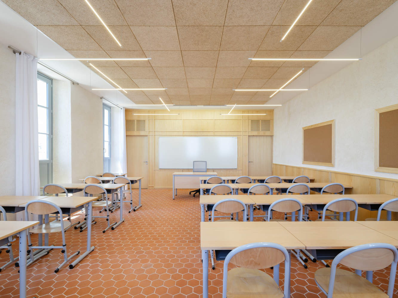 历史与现代融合:该项目将现有建筑与邻近别墅合并,展现了卓越的设计理念。通过调整楼层高度和优化垂直流通,确保了无障碍通行,同时中央庭院连接公共空间与花园,保持了学校建筑群的统一性。拱形地窖变为图书馆,教室大窗可赏地中海景,实现了历史与现代的完美融合,为学生创造了温暖且富有吸引力的学习空间。