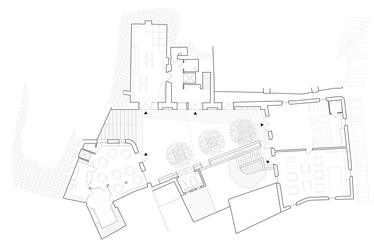 材料回收利用:使用现场回收材料是该项目的一大亮点。砖覆层瓷砖、水泥瓷砖、磨石及窗台等历史元素被巧妙重复利用,变成墙瓷、桌子和楼梯台阶等。这种方法不仅为被忽视的遗产注入新活力,还营造出尊重过去的独特环境,体现了可持续发展的设计理念。
