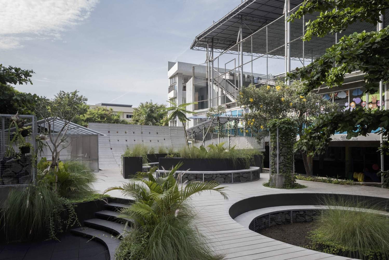 功能融合:弧形攀岩墙和温室的设计,为学生提供了丰富的活动选择。温室与室外学习区分开,创造了僻静的氛围,让学生能够专注学习。这种功能融合的设计,既满足了学生的娱乐需求,又提供了学习的场所,使户外学习空间更加丰富多彩。