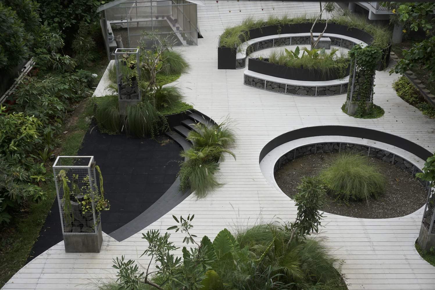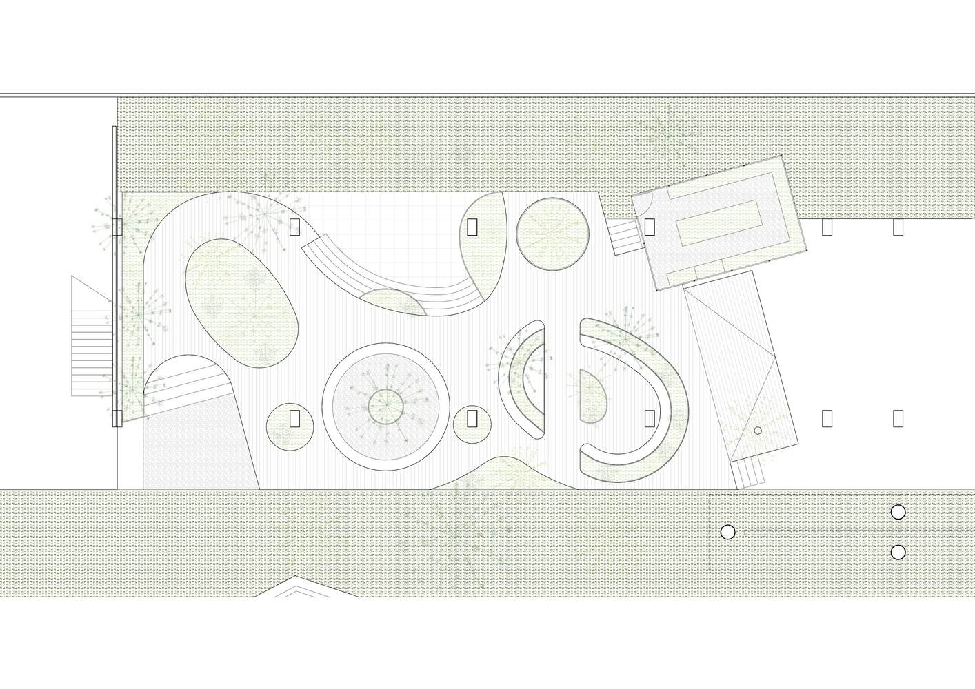 We approached the elevated floor plane as if it were a sheet of paper, cutting 'holes' that would later be filled with plants. These 'holes' were extended downward and upward to form a variety of spaces designed for different activities. This strategy seeks to evoke distinct feelings in users and address their diverse needs. For instance, a circular bench set in a sunken area may appeal to those seeking privacy and concentration, while the irregularly shaped seating atop the floor plane is ideal for more casual, social gatherings.