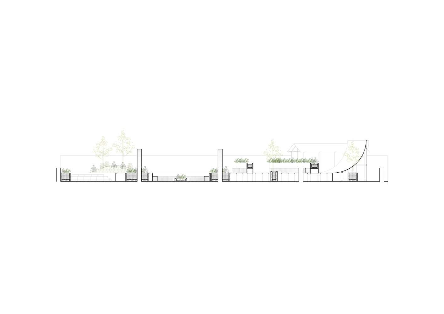 At the far end of the floor plane, we designed a curved climbing wall for students. Adjacent to this feature is a greenhouse, which remains at the existing ground level, set apart from the slightly elevated outdoor learning area. This separation creates a secluded atmosphere, allowing individuals to focus and feel transported into a different realm, despite the physical proximity of the two spaces.