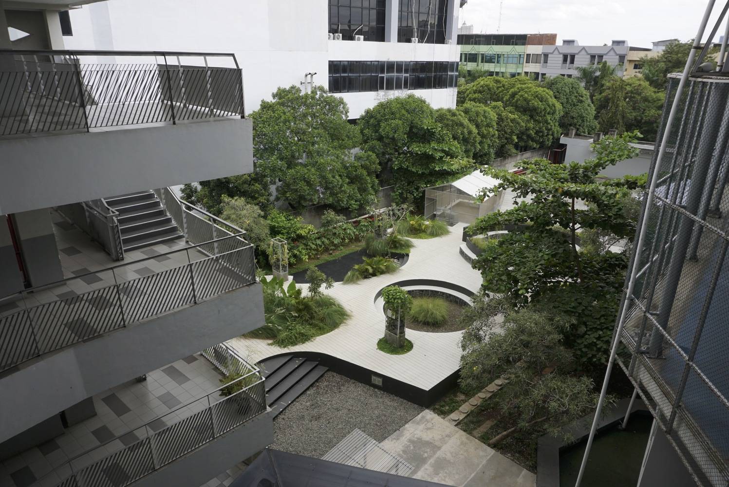 The existing site is a concrete slab intended for the eventual expansion of the school building, and we were tasked with working within these preexisting constraints. The foremost challenge was converting this concrete expanse into a green, inviting space. One of our key solutions was to elevate the floor plane, utilizing the void between the new and existing levels as planter boxes to accommodate soil and trees.