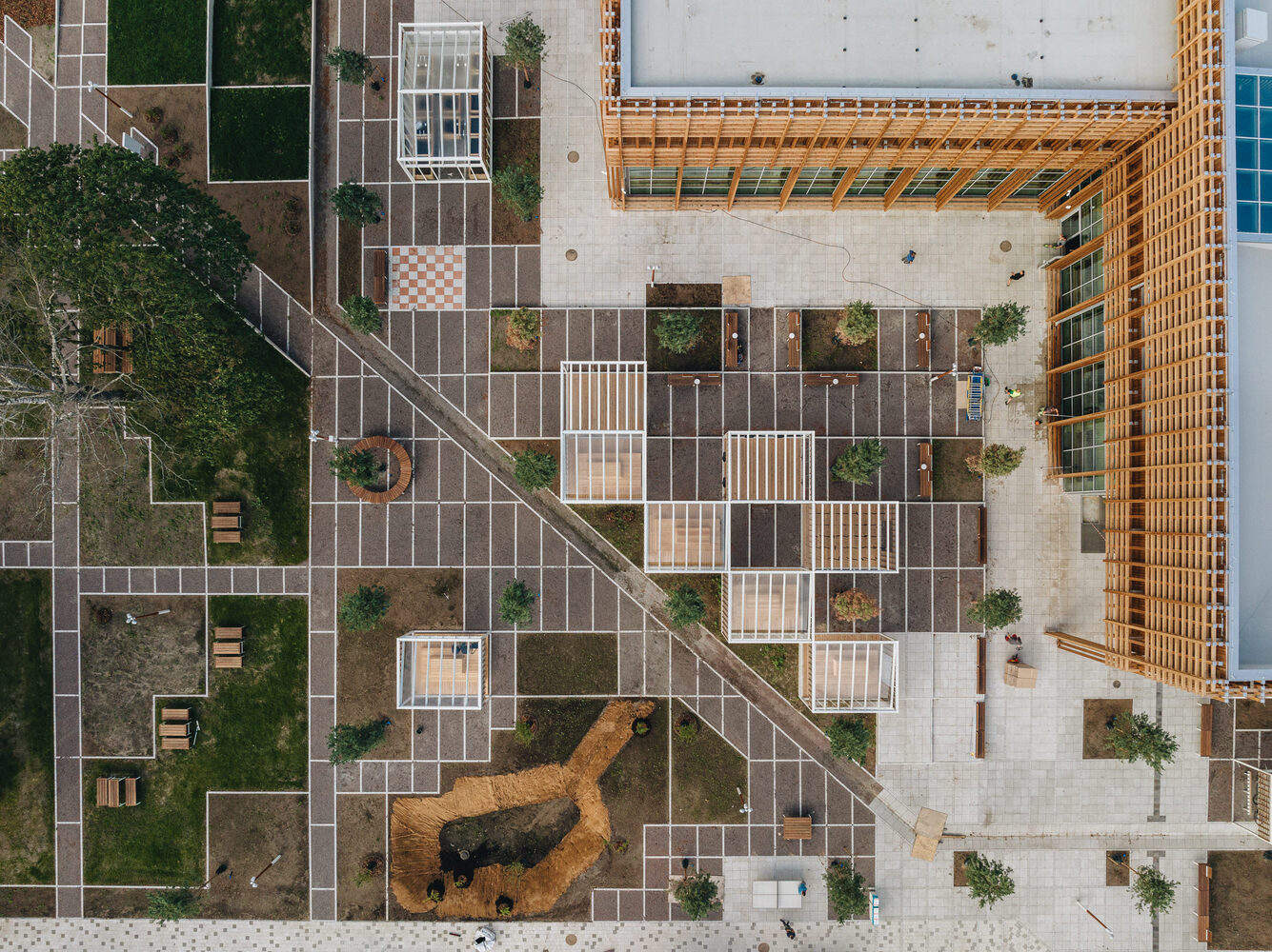 In addition to the load-bearing structure, timber has assumed various roles in the building, for instance, as a smooth and warm bench, perforated acoustic panels as well as a streamlined banister. Also, the façade is important – the timber lattice functions as a sun control and also creates a landscape of benches and nooks along the building. Within the outdoor area of varied functionalities, there is also room for creative interventions – the outdoor exhibition area along the main path allows people to explore the landscape annually re-designed by the students.