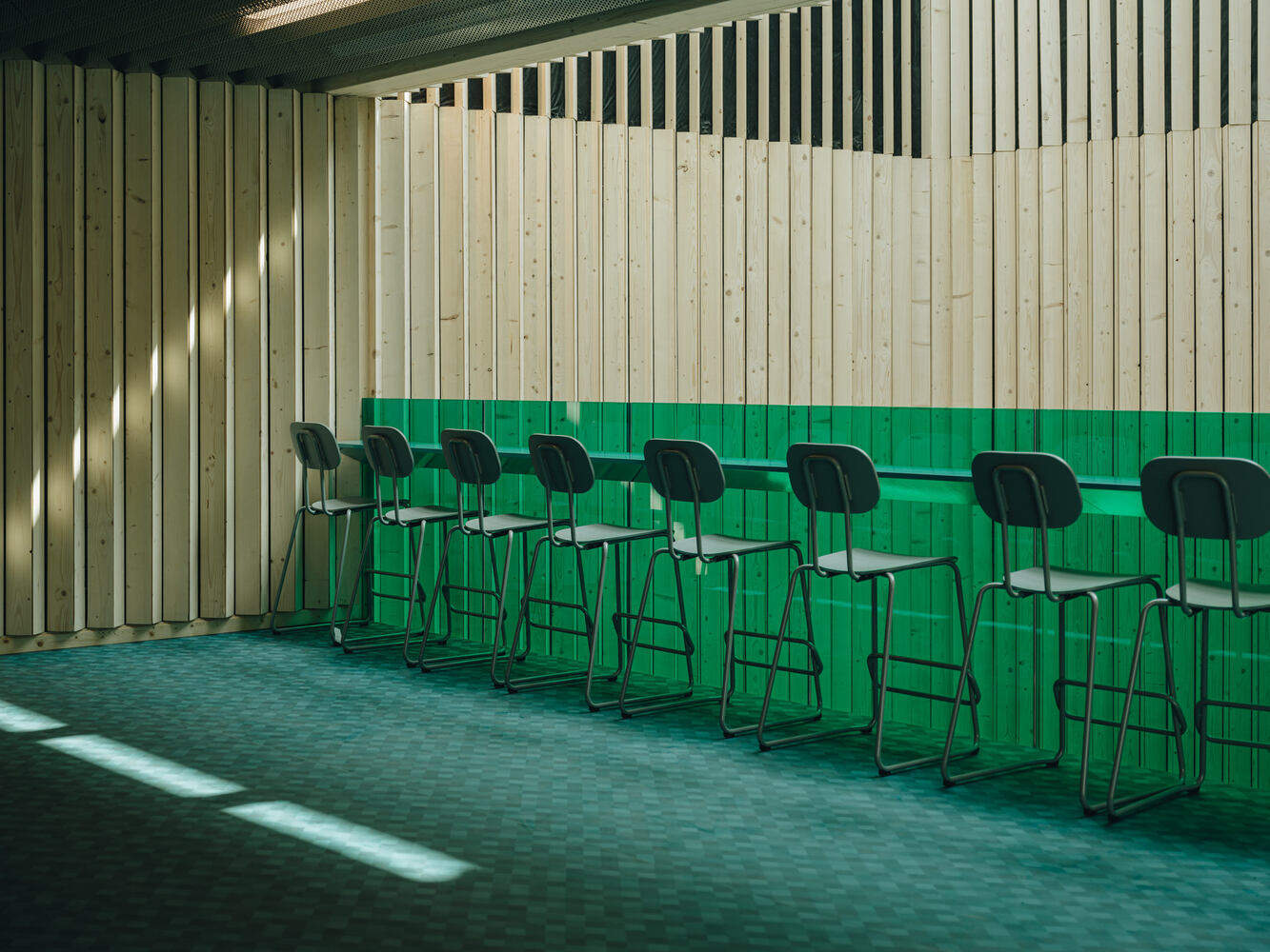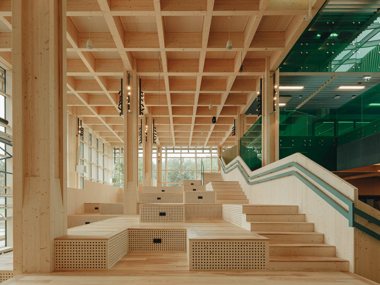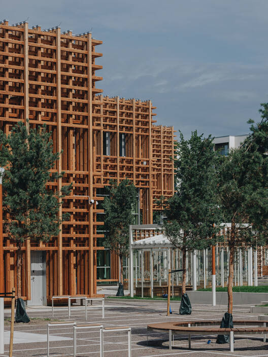 除了承重结构外,木材在建筑中还扮演着各种角色,例如,作为光滑温暖的长凳、穿孔吸音板以及流线型栏杆。此外,立面也很重要——木格栅起到了遮阳的作用,也创造了建筑沿线长凳和角落的景观。在各种功能的户外区域内,也有创造性干预的空间——沿着主干道的户外展览区允许人们探索学生每年重新设计的景观。