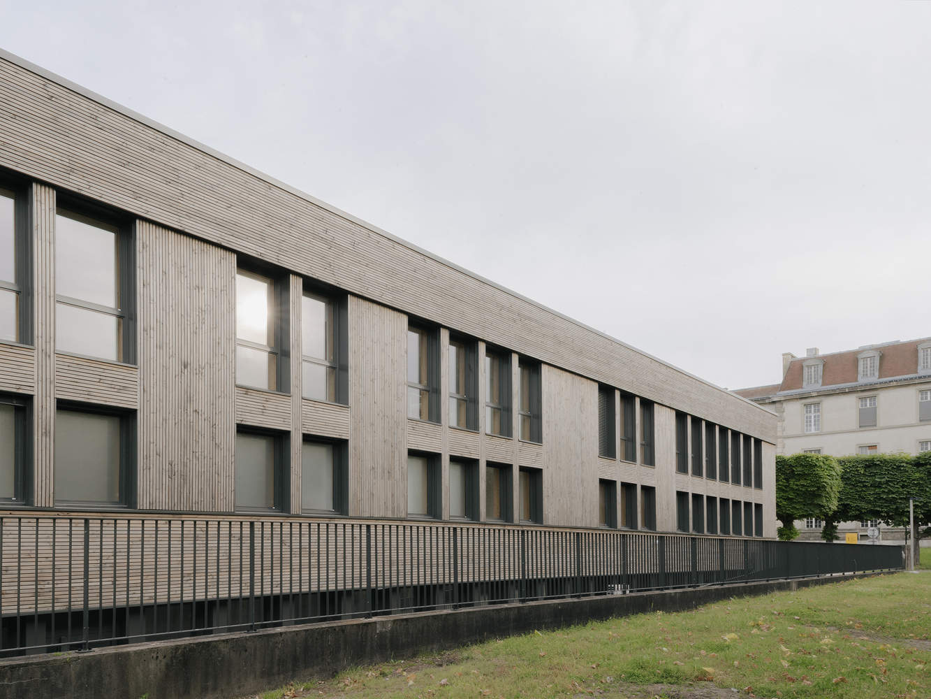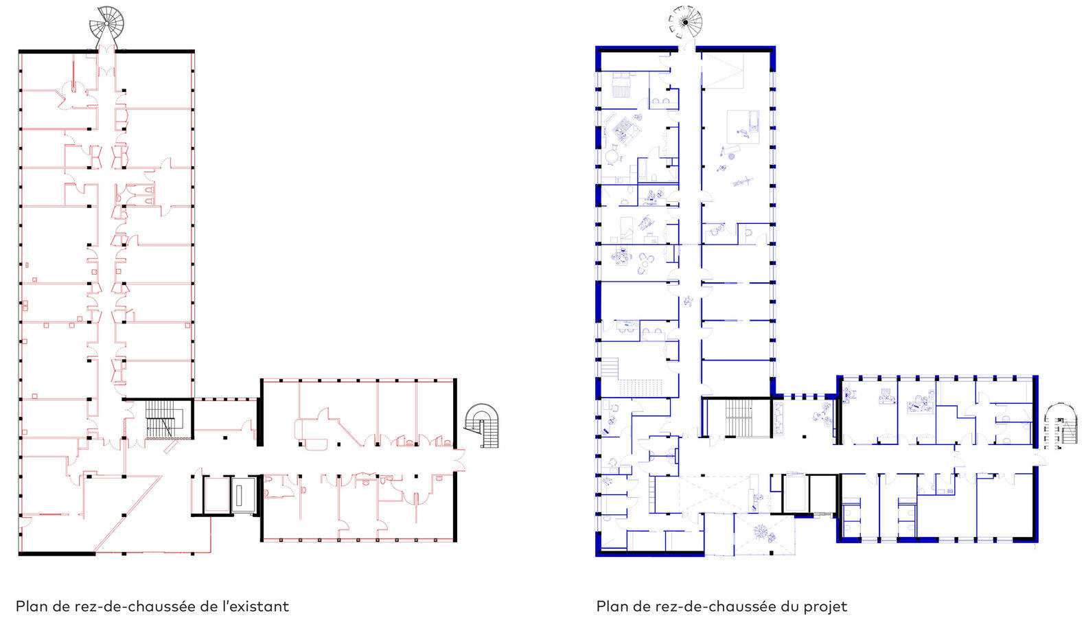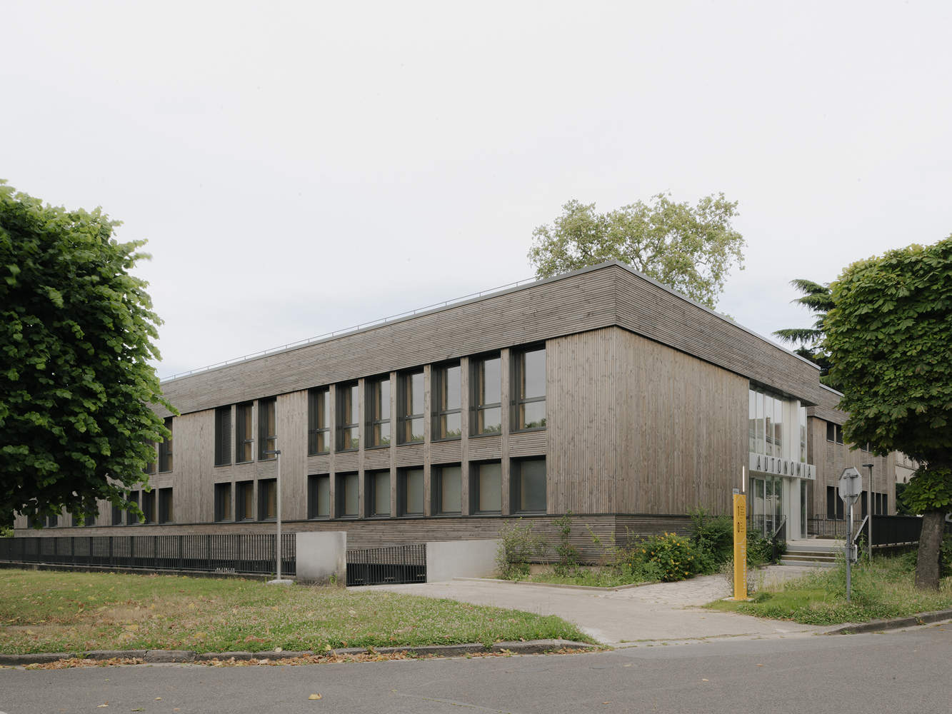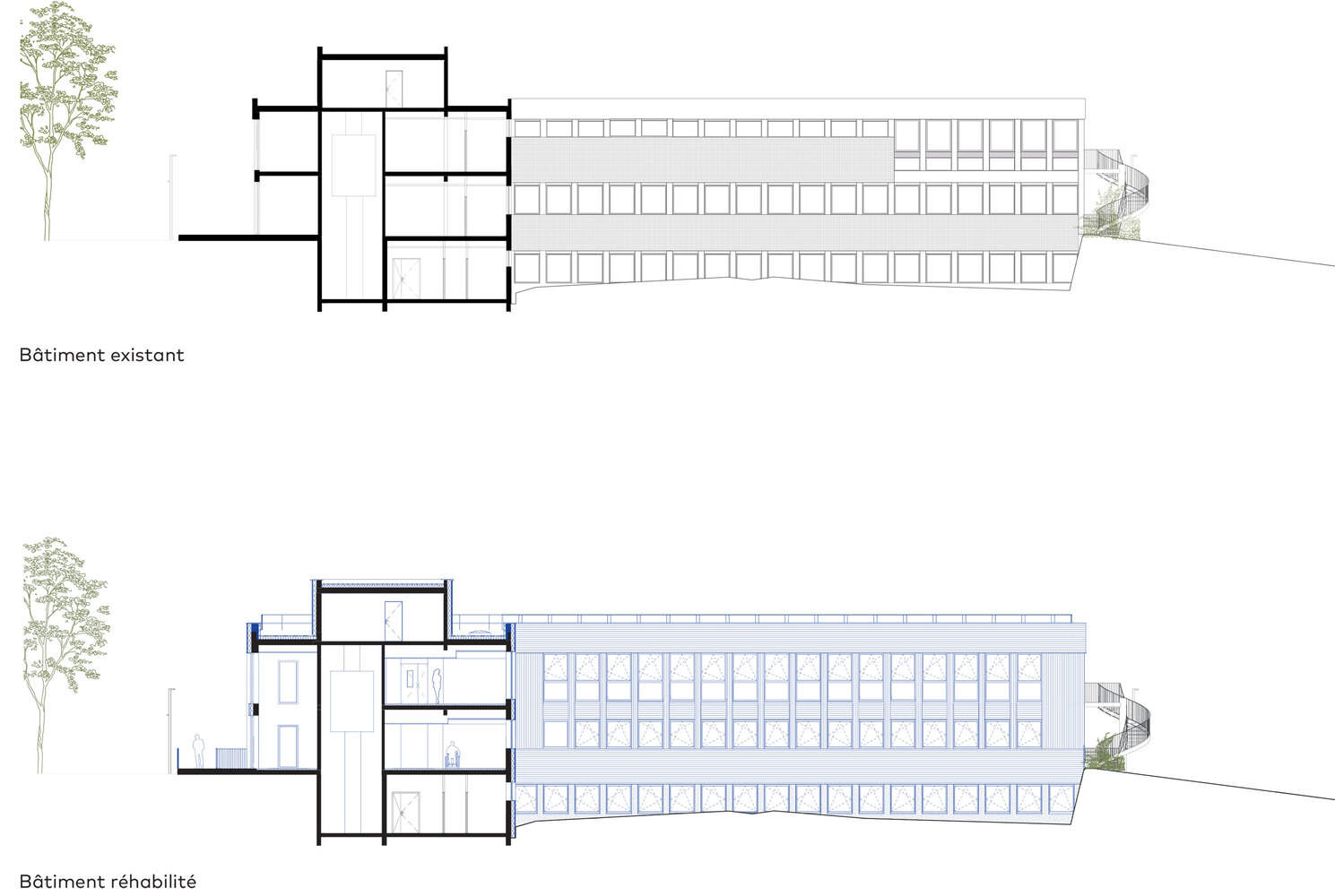 The entire building was removed and cleaned, and all of the interior partitions were demolished. Only the posts and some load-bearing walls are preserved. Also, in order to improve the readability and comfort of spaces, the majority of openings are enlarged to guarantee a good level of light and unobstructed views. The partitions are completely reviewed in order to respond to the needs of the program, and the facades are insulated and cladding to improve the thermal comfort of the building. The facades are insulated from the outside with glass wool and then covered with false clerestory cladding in Douglas massive of French origin. This thick cladding ensures very good resistance over time and its treatment by gray impregnation offers lasting protection by autoclave, which allows you to get closer to the natural appearance obtained after several years of outdoor exposure.