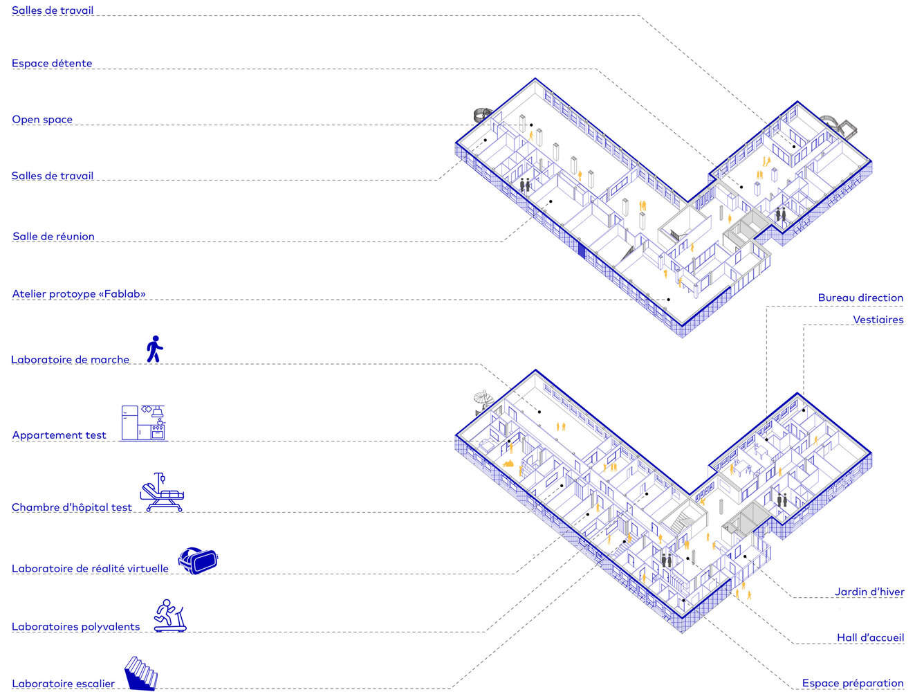 The ground floor includes the reception areas, logistics support offices and experimentation rooms allowing people in loss to be put into a real situation autonomy, through walking tests and life actions daily on a real scale. Users, patients, doctors and researchers, are thus immersed in recreated living spaces such as the home, the bedroom hospital, the connected staircase, the movement analysis platform, or the doctor's office. The second level upstairs is dedicated to researchers and consists of a manufacturing workshop for prototypes (fablab), work and conference rooms, offices and a vast convivial space. Maximum flexibility is provided to search spaces with numerous open spaces, which allows you to consider different layouts and multiple uses.