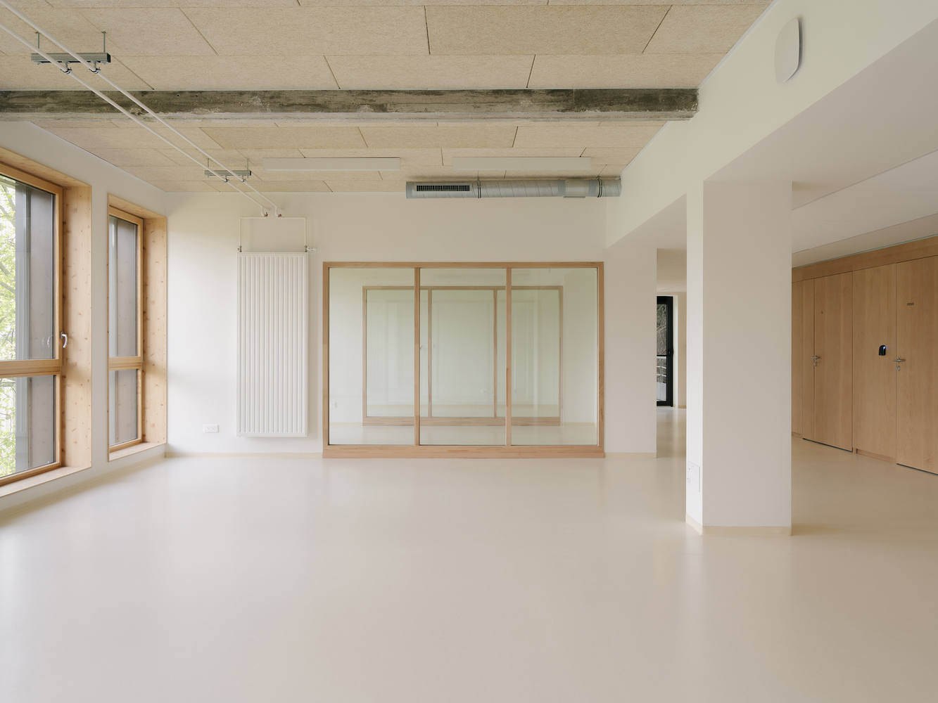 The use of wood indoors contributes to the creation of a warm and familiar environment, both for doctors and patients. The species used, sycamore and beech, stand out by their slightly pink and soft color, which accompanies users through the different spaces. On the ground floor, access is particularly highlighted with the design of a generous double-height hall, clad in wood and transparently visible from the upstairs circulation landing. A reception desk is integrated into the entrance to provide orientation to visitors in the different services, in addition to clear and readable signage. Upstairs, the layout is based on the creation of functional walls in wood, which structure and dress the interiors, conceal the technical organs and integrate cupboards and storage.