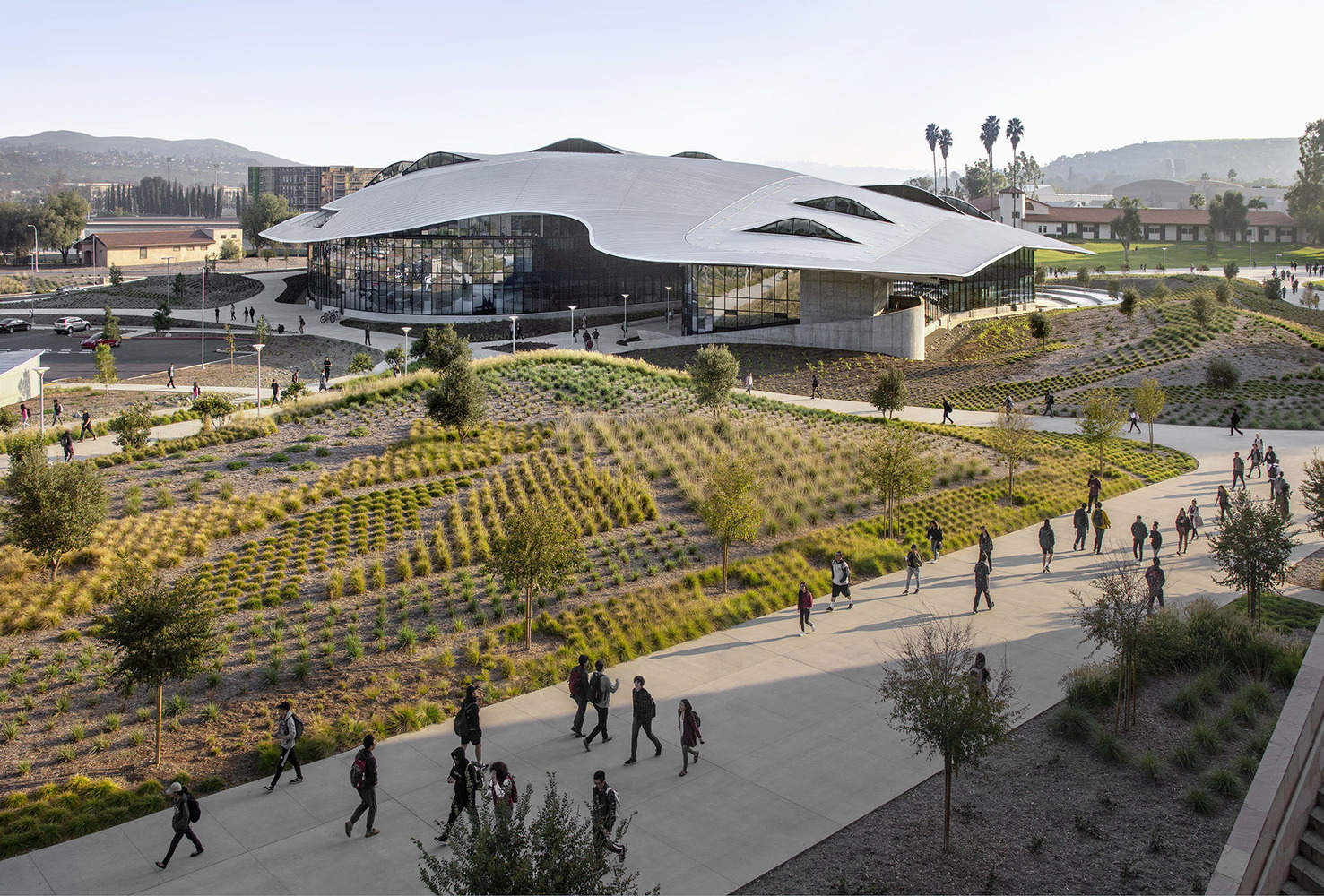 它通过创建一个令人难忘的大学介绍,进一步将建筑与其背景联系起来,该介绍参考了校园的地形、山麓和附近的圣加布里埃尔山脉。为了缓解沙漠气候,两英亩的屋顶充当了主要的遮阳装置。建筑师使用了大量的日光、眩光和太阳能热增益分析模型来优化屋顶几何形状,最大限度地减少照明和制冷的能源负荷,并提高用户的视觉和热舒适度。该项目已获得LEED白金认证。
