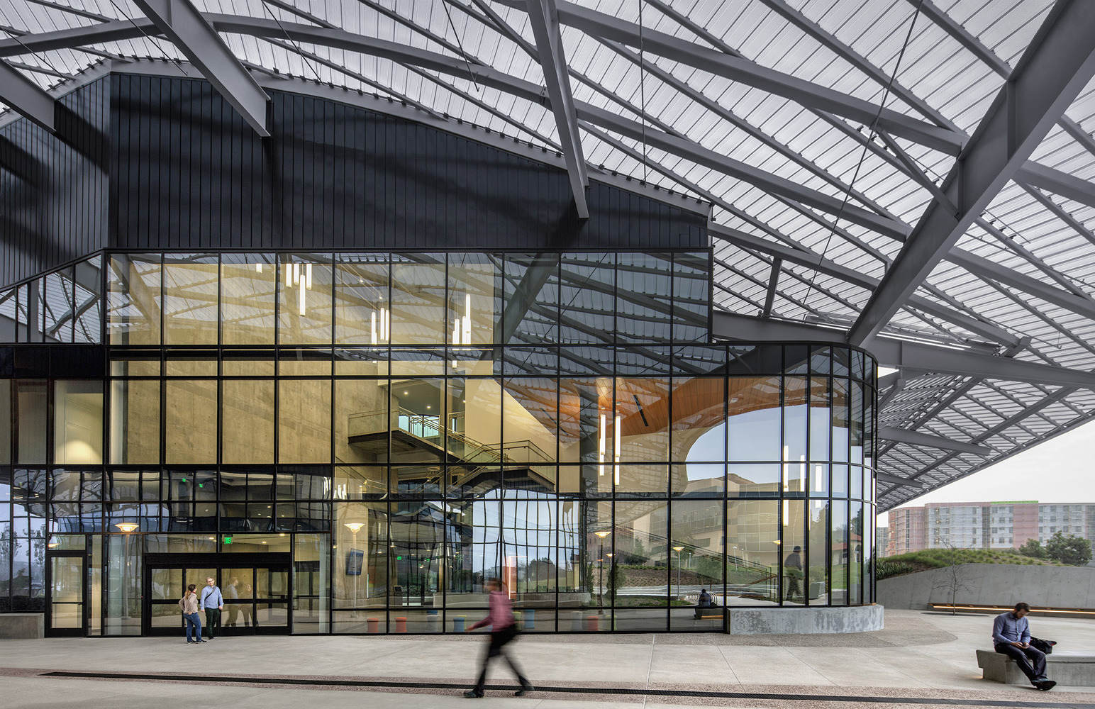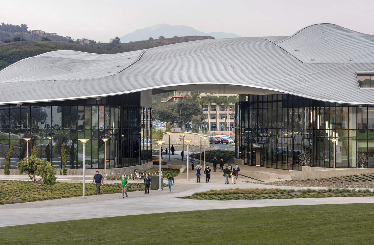 门户建筑的创新设计:学生服务大楼以其波浪形的直立缝铝屋顶和独特的结构布局,成为加州州立理工大学波莫纳校区的新门户。该设计不仅优化了能源管理,还最大化了日光利用,并提供了周围环境的景观。这种以性能和功能为驱动的设计,实现了能源使用强度的显著降低,展现了建筑与环境和谐共生的设计理念。