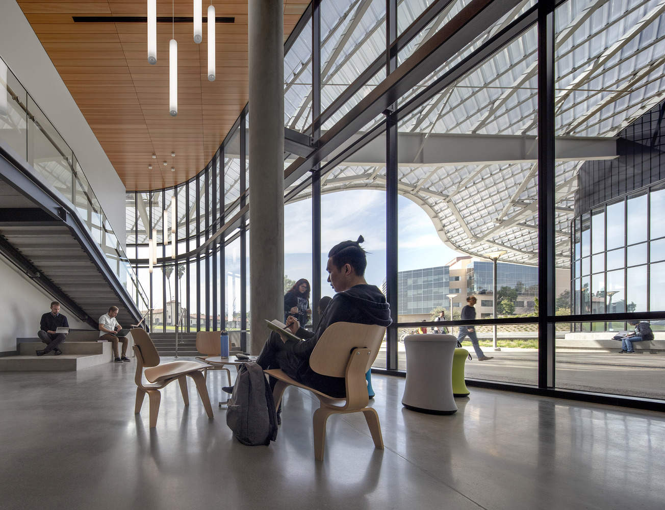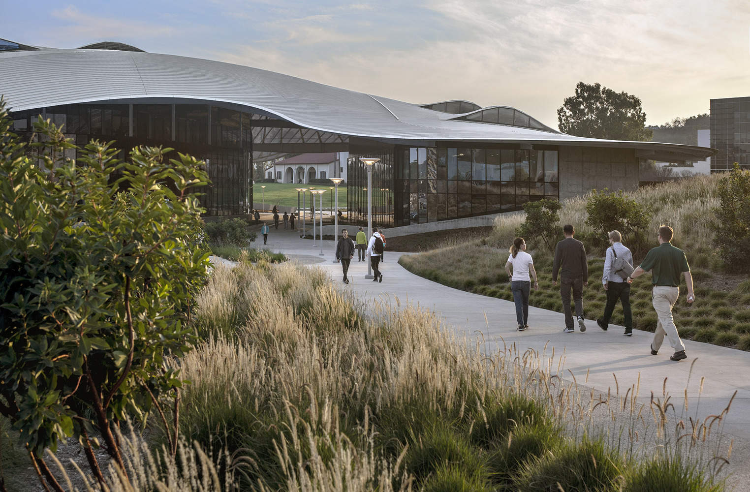 Landscape.Spurlock Landscape Architects has taken a master planning approach to this design to create a unified vision to make the East Campus area more functional, help coordinate future work in surrounding areas, and build overall cohesiveness. The organic nature and shape of the building—along with landscaped berms planted with drought‐tolerant grasses—mimic the surrounding foothills and create the impression that the building is growing out of the landscape.