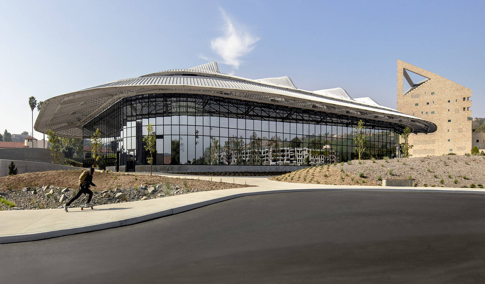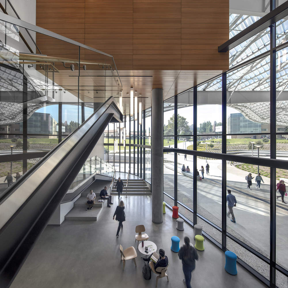 It further ties the building to its context by creating a memorable introduction to the university that references the topography of the campus, the foothills, and nearby San Gabriel Mountains. To mitigate the desert climate, the two‐acre roof acts as the main shading device. The architects used extensive daylight, glare, and solar heat‐gain analysis modeling to optimize the roof geometry, minimize energy loads for lighting and cooling, and increase user visual and thermal comfort. The project is LEED Platinum certified.