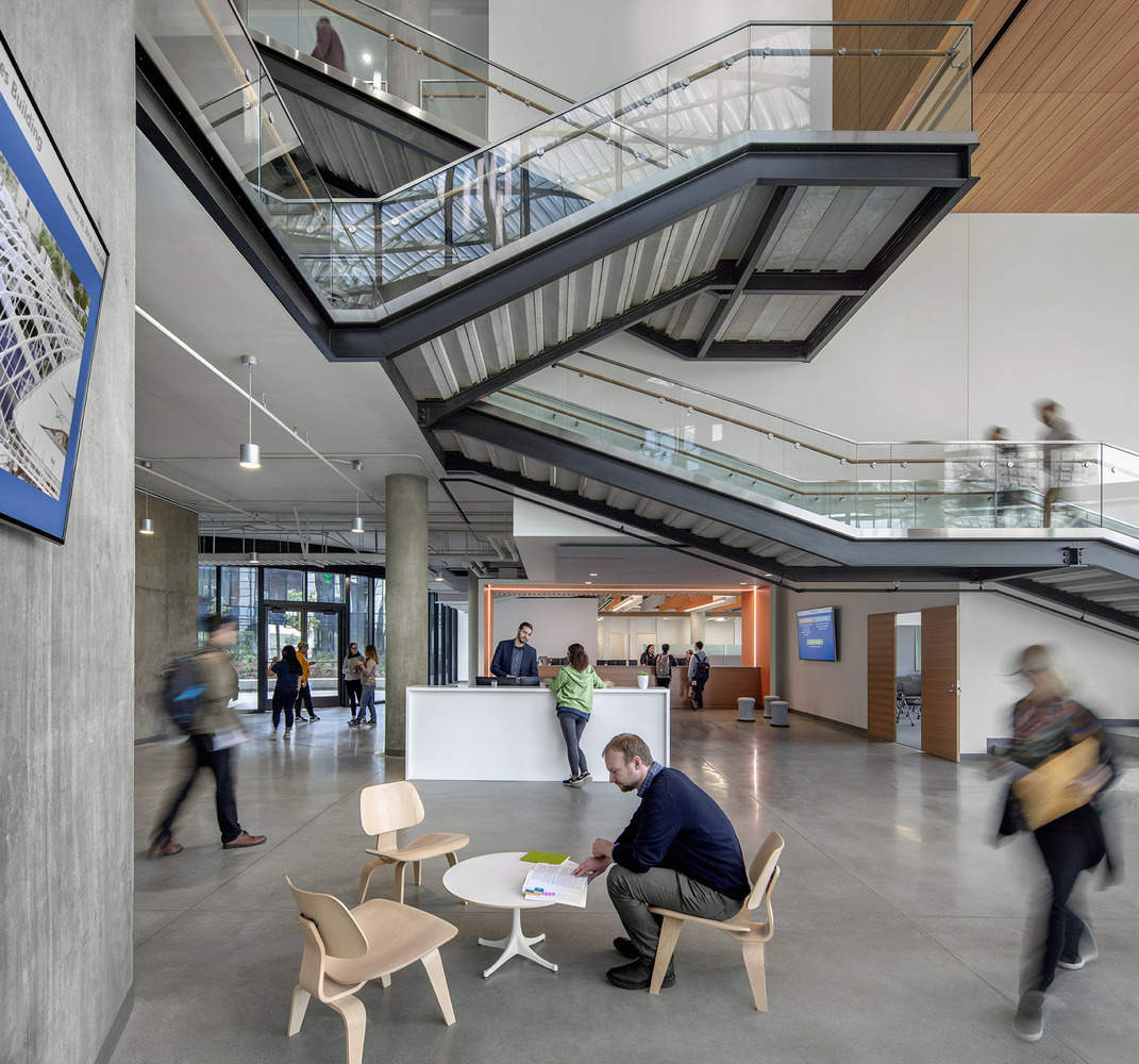 宽阔、开放的通风道将三层主楼与两层楼高的多功能中心和人力资源部翼楼隔开。这条拱廊从主停车场通往学生会和图书馆,其设计感觉就像一条阴凉的户外街道,两旁有座位和聚会设施,同时将学生与校园中心连接起来。三层楼高的大厅楼梯是开放的,吸引人的,以鼓励建筑居住者之间的垂直流通、协作和自发对话。