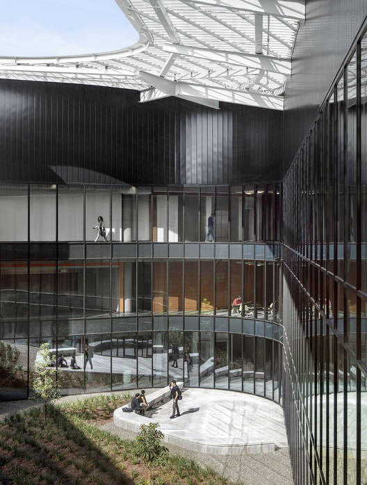 与起伏的屋顶相连的新建筑在地面上有一个宽阔的中央广场。这个中心节点已经无缝地融入了主要的校园流通系统。这个空间反映了上方屋顶天棚的动态阴影图案,是一个户外休憩场所、大厅空间和休息的地方——打电话、见朋友或喝咖啡。它足够大,可以容纳小型食品车,并为各种规模的聚会提供区域,以及学生、教职员工和访客的休息空间。