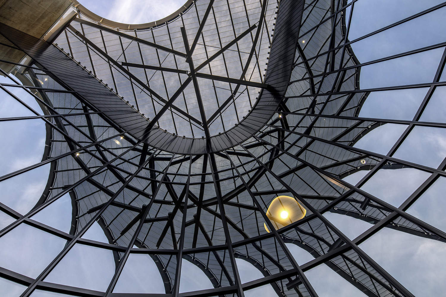 除了遮蔽综合体两翼之间的开放式人行道外,90000平方英尺的屋顶穿孔金属悬挑的深度从5英尺到28英尺不等(取决于朝向),以保护铝框低反射玻璃外墙免受阳光照射,过滤斑驳的阳光,并优化室内的采光。为了实现直立缝屋顶的复杂曲率,利用辊模技术在现场制造了定制形状的面板。屋顶需要大约19000个连接夹来固定面板。直立接缝的连续东西对齐赋予了屋顶纹理和纹理,同时允许天窗为顶层提供更多的日光。直立缝屋顶很少如此复杂。这一创新应用符合CO Architects使用数字技术探索、分析和优化选项的方法,并促进从直接设计到使用BIM进行制造和安装的过渡。