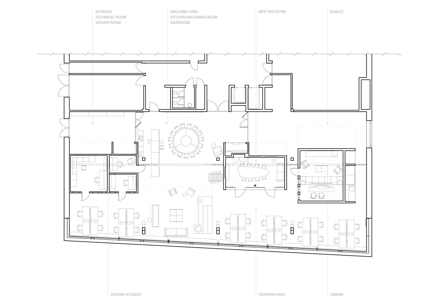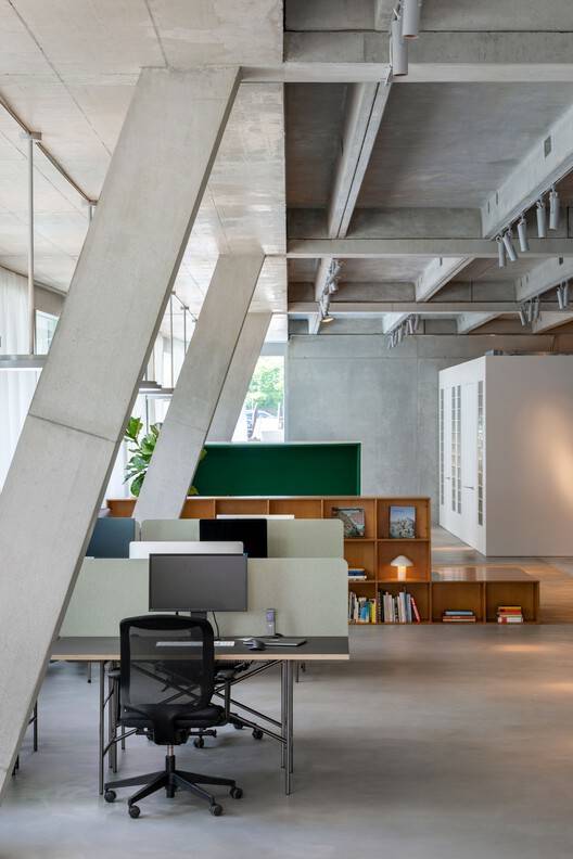 建筑师提供的文字描述Dynamic Frame是位于瑞士苏黎世市中心的同名电影制作公司的办公室。应客户要求,该局设计了一个多功能空间,以满足公司不同地区的需求。该空间包括编辑工作室、一个小型电影院、一个仓库、一个带餐厅的厨房和一个可供14人团队使用的开放空间。