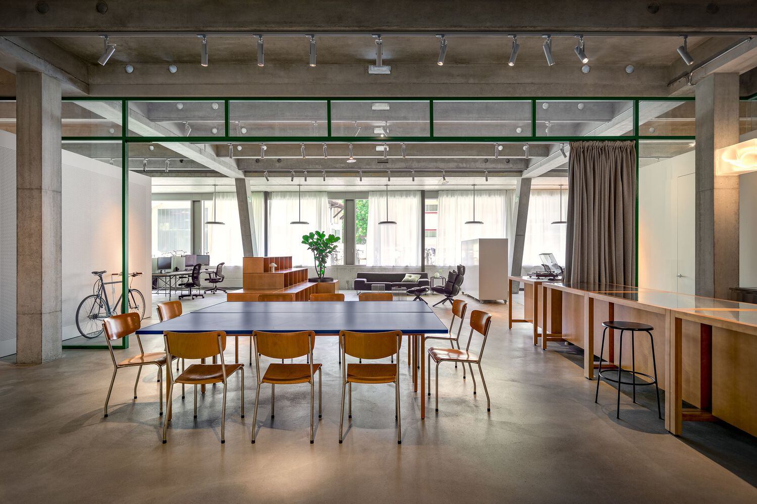 任务-此前,Dynamic Frame在苏黎世有两个办事处,一个负责小说和纪录片制作,另一个负责商业广告。然而,是时候将专家们团结在一个空间里了,所以客户选择了一个有成长空间的空间。他们决定在公司需要之前转租部分办公室,并最终占据整个空间。这部电影的名字很适合它的团队和他们的工作风格:员工们经常搬家,办公室通常会聚集很多人。头脑风暴、推销、向客户演示、制作视频材料及其后期制作——我们需要创造一个真正多功能、适应性强的空间,自然适合团队的任务。电影制作的细节需要多种功能:除了设计传统的工作空间外,我们还必须控制噪音,并为在隔音和声学方面要求很高的编辑室开发设计。