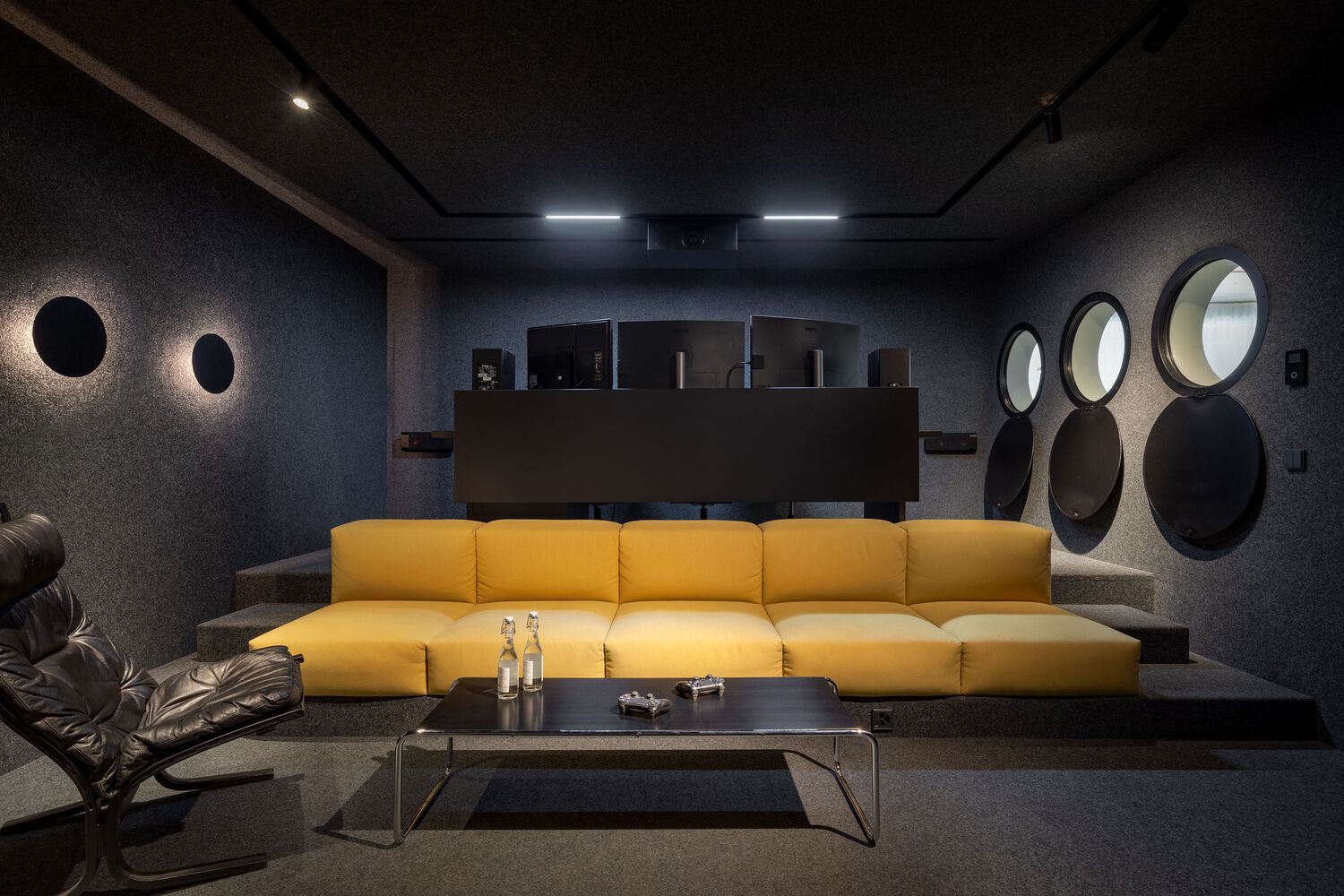 Construction - The new office is located on the ground floor of a new building in Zurich's Binz district. This is a former industrial area where bricks were once produced. We played up the characteristic facade with round windows in the interior of the office. When we started working on the project, the building was unfinished – there were no windows or flooring. There were no utilities either, which allowed us to immediately plan everything according to the functions of the future space. The exposed concrete beams and bare walls required additional acoustic solutions – so we engaged a specialist from Kyiv to develop a project. According to his instructions, we decorated the cubes with perforated plasterboard, which not only looked attractive but also absorbed sound. Together with the Ukrainian company Expolight, we developed a lighting project for the office: due to the specifics of our clients' work, it was important for them to have high-quality and interesting lighting. Separate scenarios for each area of the office can be controlled via the app on the phone: adjust the warmth, color, and intensity according to the time of day or mood. For example, in the cinema, there are scenarios for working on video materials, watching a movie with a client, and discussing.