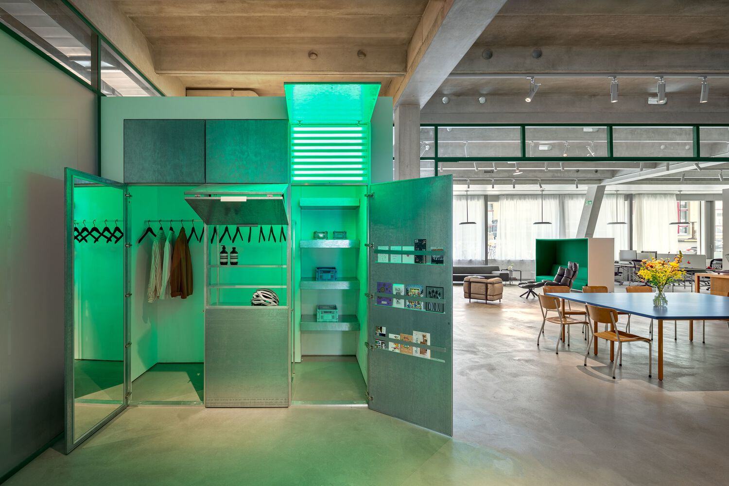 设计-衣帽间-在办公室入口处,游客会看到一个定制的镀锌钢衣帽间——我们想把它打造成一个复古的电影院售票处。它的功能必须比普通的衣帽间更广泛——在活动或聚会期间,它可以用来分发邀请函、门票或纪念品。架子是可折叠的,可以作为展示柜。在衣帽间的门上,我们为明信片提供了松紧带,为眼镜和小饰品提供了架子。门上还内置了一个RGB灯,可以更改和自定义背光的颜色厨房和餐厅-对客户来说,计划一个完整的厨房和足够的用餐空间很重要——团队喜欢做饭和聚在一起吃午饭。用餐组由HAY桌子和复古椅子组成。用餐区的墙上挂着电影制作公司拍摄的电影海报。厨房有你做饭所需的一切——它配备了烤箱、炉灶和油烟机。这个区域装饰着一条宽的不锈钢带。它由第二个视觉条带支撑——一个由单个块组装而成的木制厨房岛,由乌克兰承包商Cassone根据我们的草图制作。其中一块是留给有唱片的黑胶唱片播放器的。RGB灯提供额外的照明,并允许您通过选择不同的颜色来改变该区域的氛围。主要的开放空间和休息区沿着前窗排列,那里有很多自然光。在这个开放空间里,我们必须在公共区域和各个工作站的隔音需求之间取得平衡。开放空间中的桌子有隔音隔板。