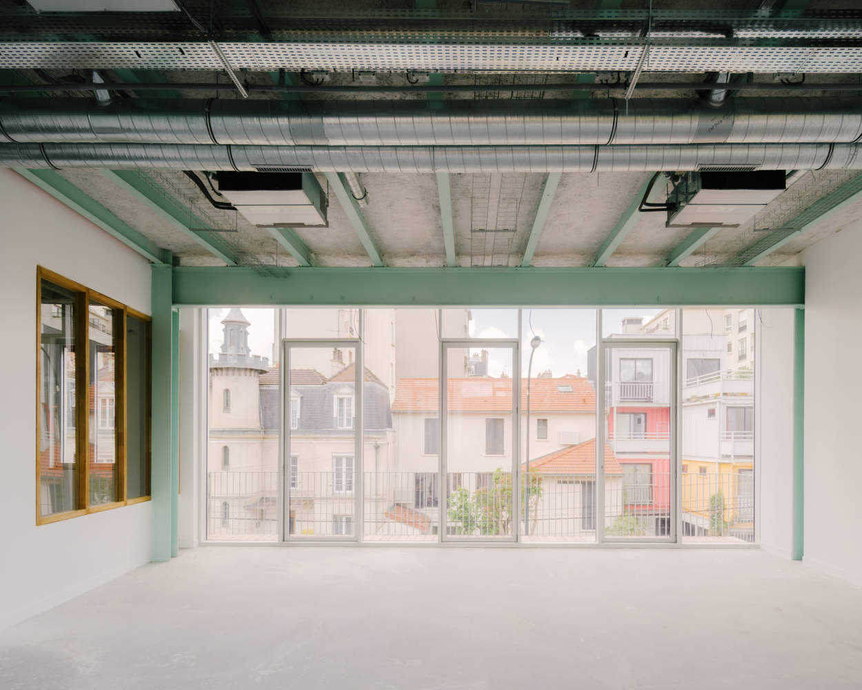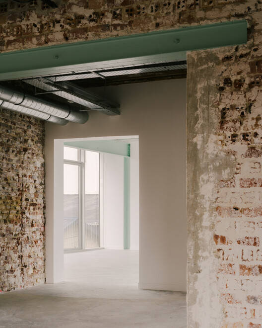 Situated Interventions - The original construction, dating from the early 20th century, is stripped of its plaster to reveal the composition of the facade and the original brickwork, restoring its strong identity as a production site. The 1950s extension, including the bridge building and the elevation, is dressed with a new curtain wall to replace the existing asbestos-clad one. Above the entrance, the project takes advantage of the setback of this extension to install cantilevered balconies that align with the street. These "extra" spaces provide a new quality to the premises and offer an outdoor space on each floor.