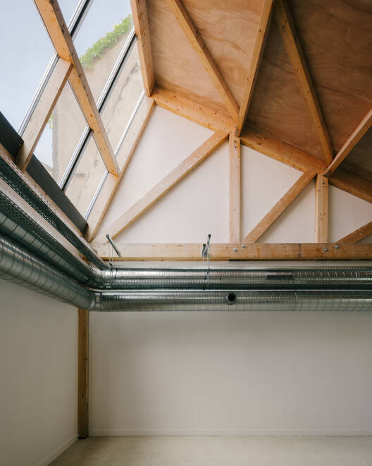Natural light becomes a key feature of the interior spaces, benefiting from solar gains for winter heating. These gains are controlled in the summer through the use of external textile blinds (in the main building) and solar-control glazing (in the hall). These simple systems are combined with the thin-built thickness or vertical draft effect to promote natural ventilation through openings in the facade or the height of the skylight. The sizing and use of mechanical equipment can thus be minimized. Within the building, the openings discovered during the works are maintained with glazed walls identifiable by wooden joinery. These create unique views that connect spaces and constructions from different periods. Wood, also present in the hall and forming the framework of the reconstructed shed, addresses technical (lightness) and logistical (accessibility at the rear of the site) challenges while providing the visual and tactile qualities to the spaces it shapes.